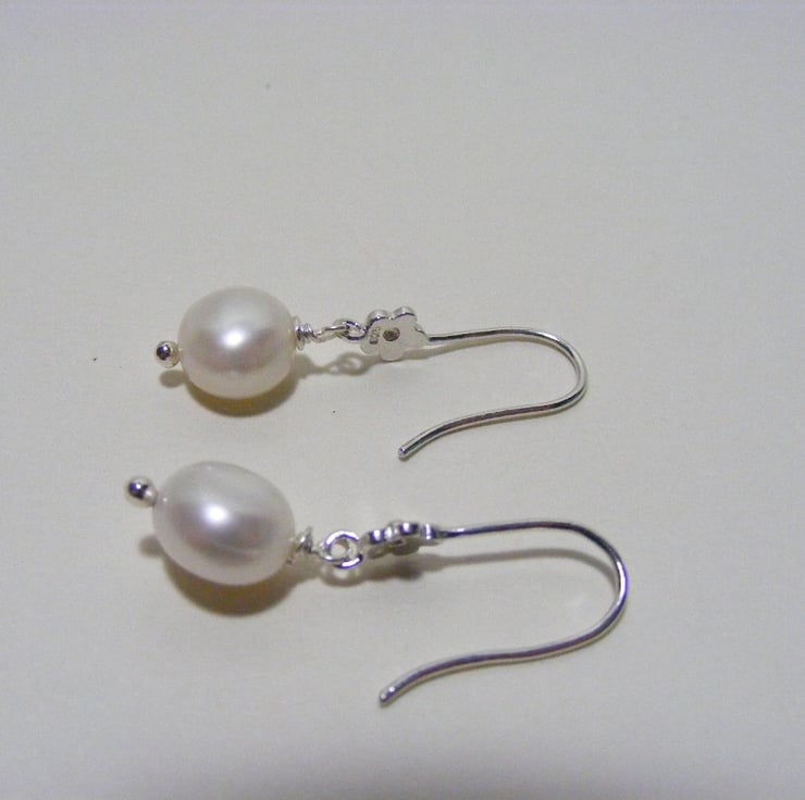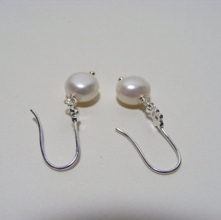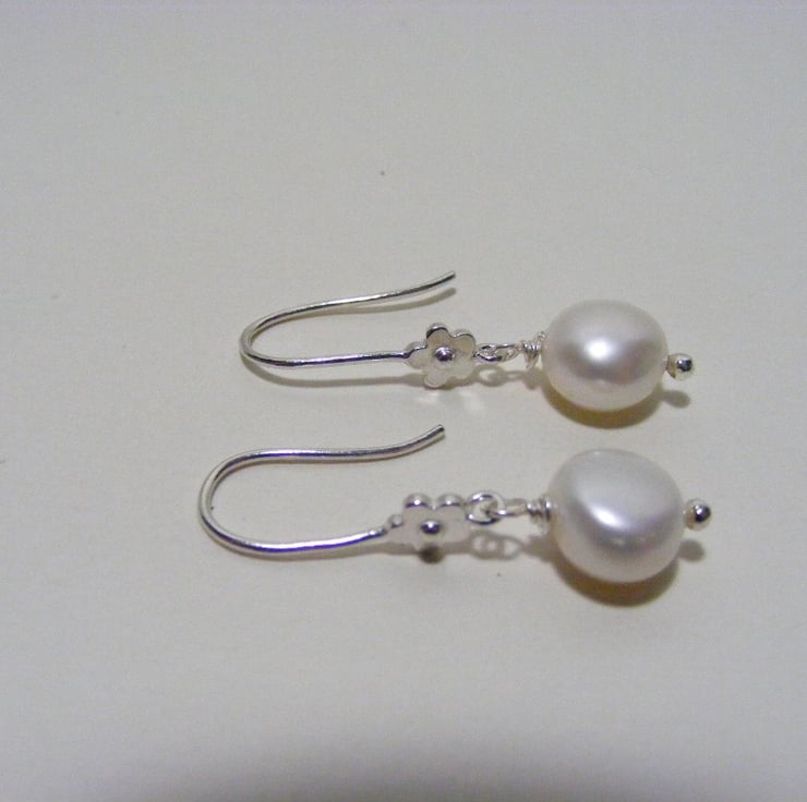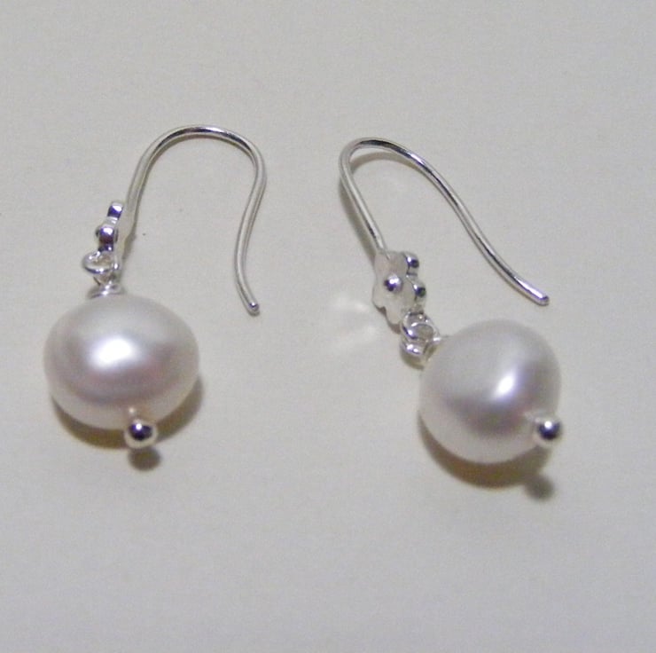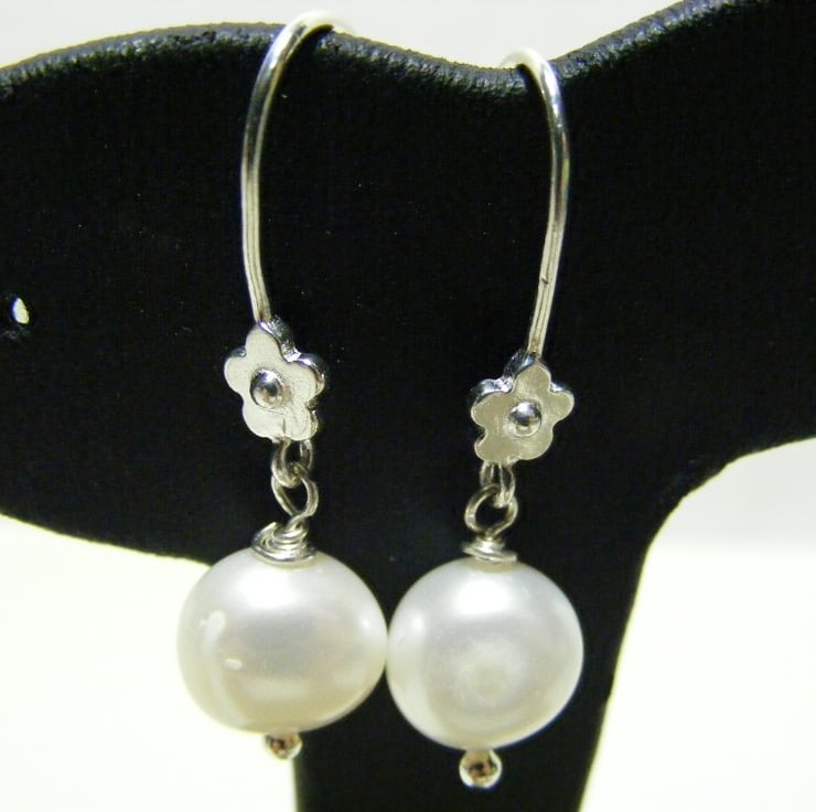 I have made these earrings by threading 10 mm white button freshwater pearls onto 925 sterling silver ball headpins. Attached ear wires are also 925 sterling silver with 925 stamped on the ear wire inside the flower.