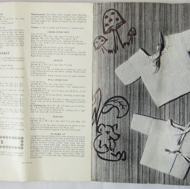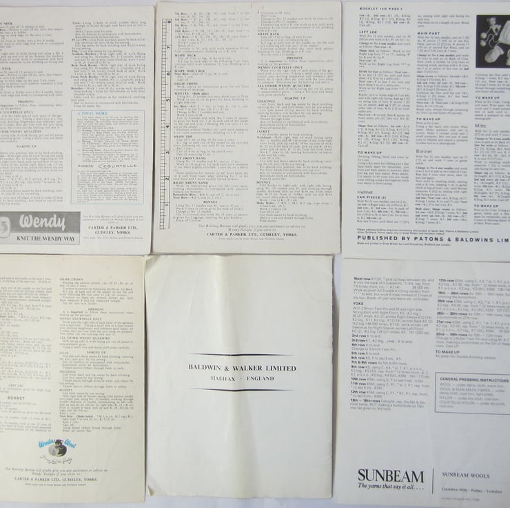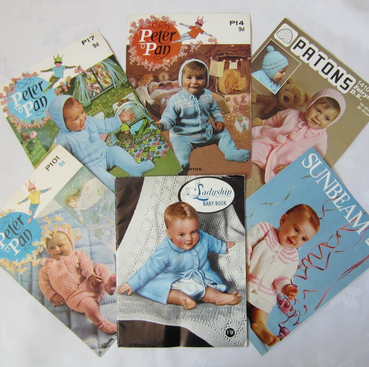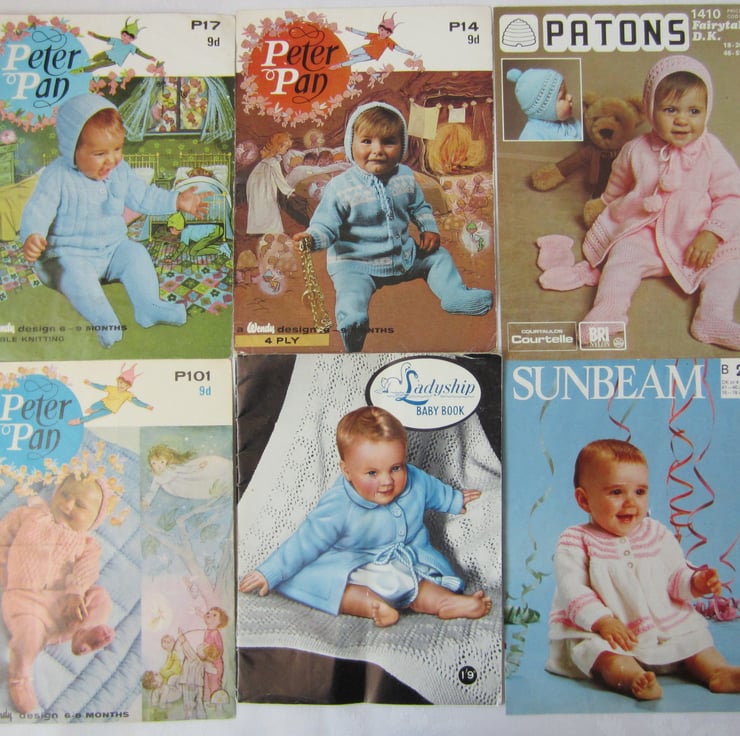 Selection of 6 vintage knitting patterns for babies: pram sets, matinee coats, leggings, bootees, blankets, shawls, cardigans, vests and lots more.