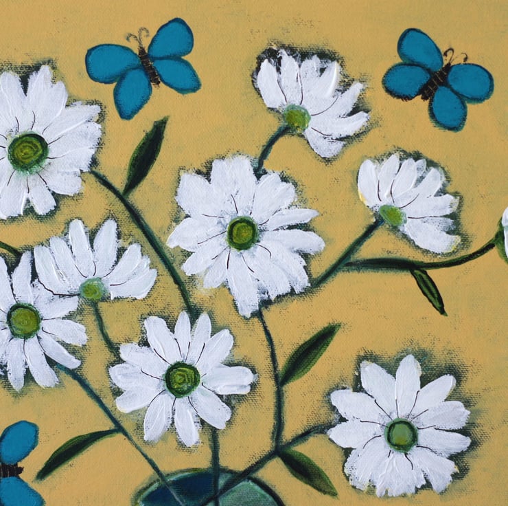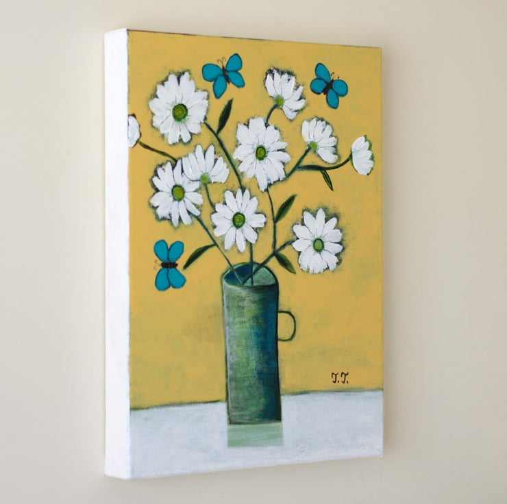 This is an original still life painting featuring a white daisies bouquet in a green jug against a yellow background. There are also three turquoise butterflies flying above the flowers. The edges of the floral painting are painted in white so the image stands out beautifully. The artwork measures 12" x 16" x 1.5" and it comes with a Certificate of Authenticity. Title: Three Friends
