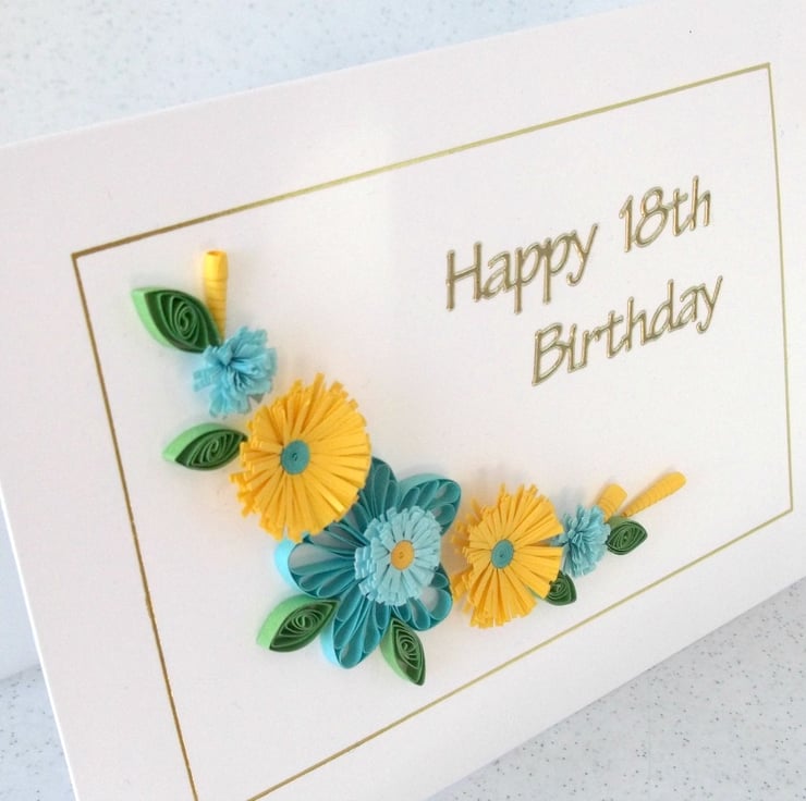 Quilled happy 18th birthday card with quilling flowers - but this card can be for any birthday - 21st, 30th, 40th, 50th, 60th, 65th, 70th, 75th, 80th, 85th, 90th, 95th, 100th