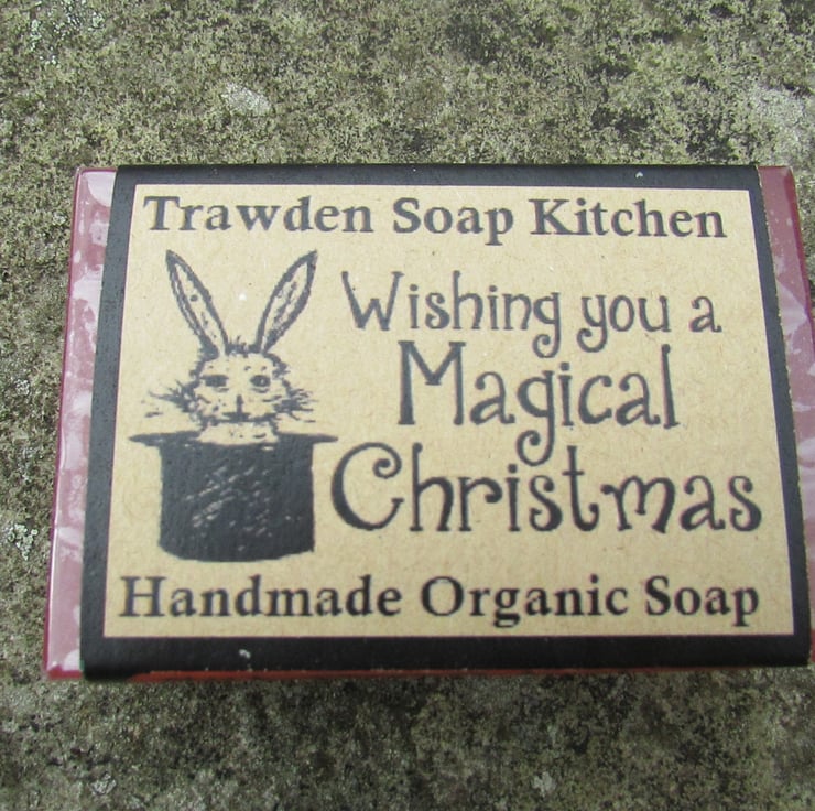 One 100g Soap bar with a festive labels, bunny in a hat "wishing you a magical Christmas"
