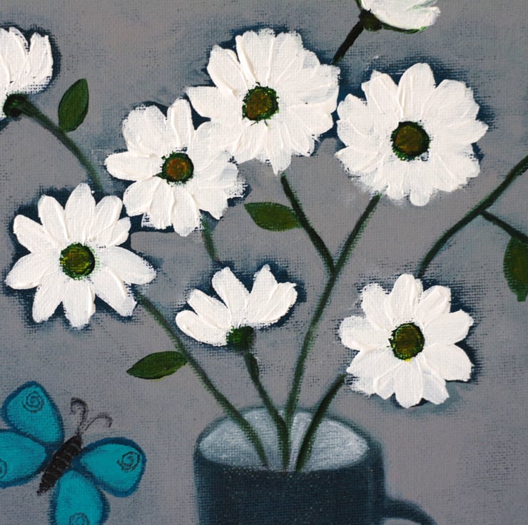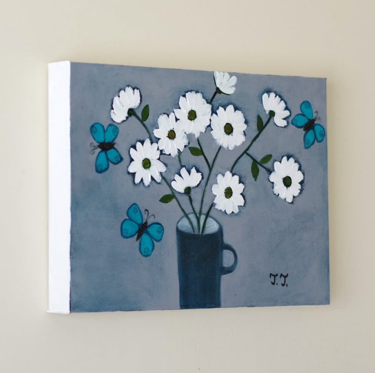 This is an original still life painting featuring a white daisy bouquet in a jug and three turquoise butterflies against a grey background. The edges of the floral painting are painted in white so the image really stands out. The artwork is ready to hang and it measures 13.3" x 9.5" x 1.4". Title: Happy Little Butterflies. My floral paintings are very popular as wedding gifts.