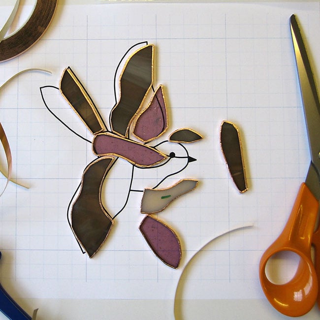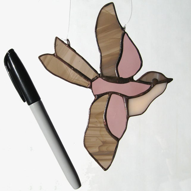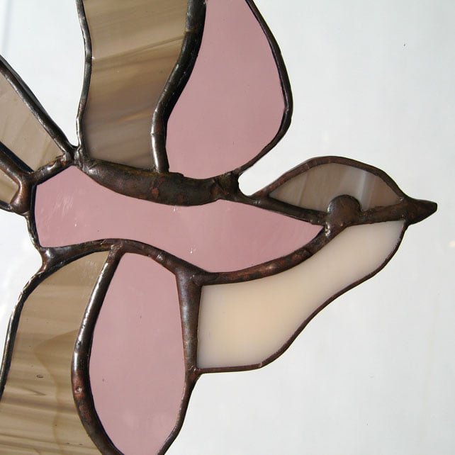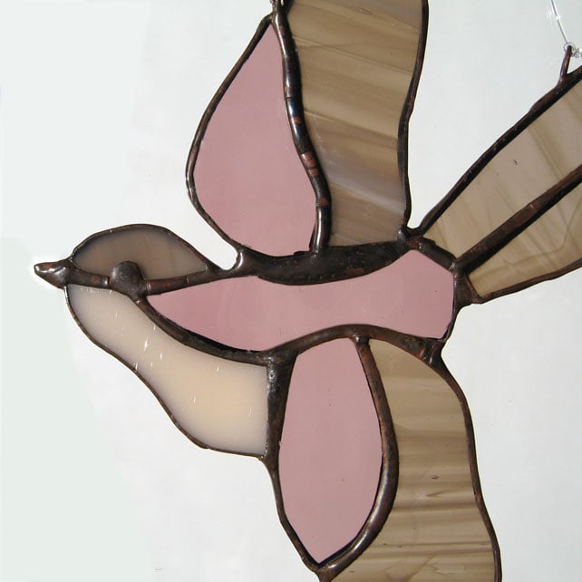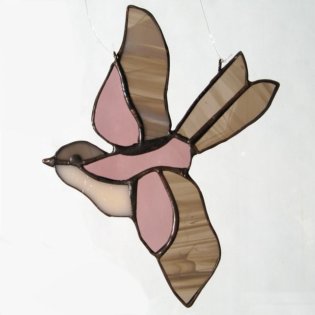 This little bird light catcher has been made using the copper foil technique. Each piece of shaped glass is edged with copper foil, soldered together and finished with a polished bronze patina.