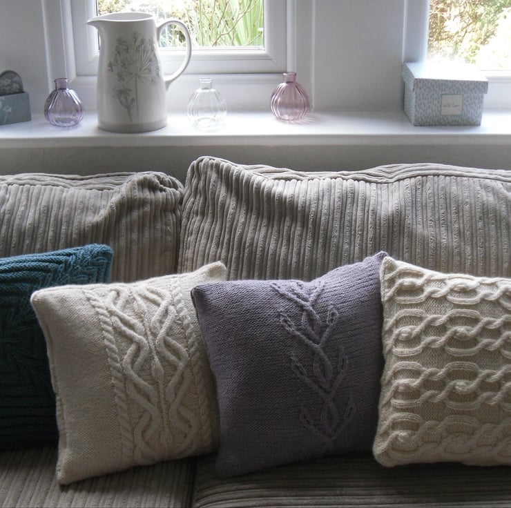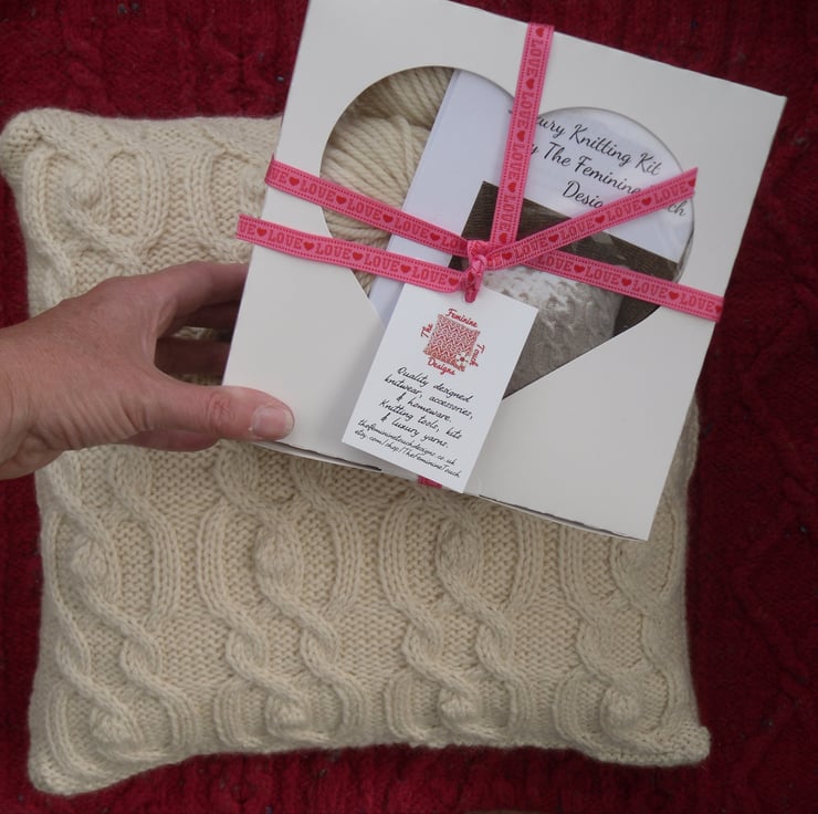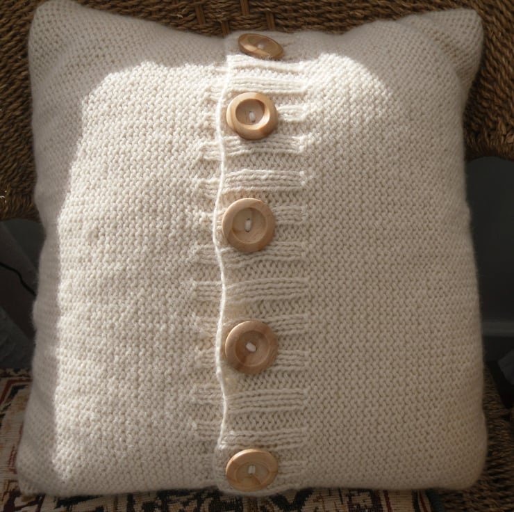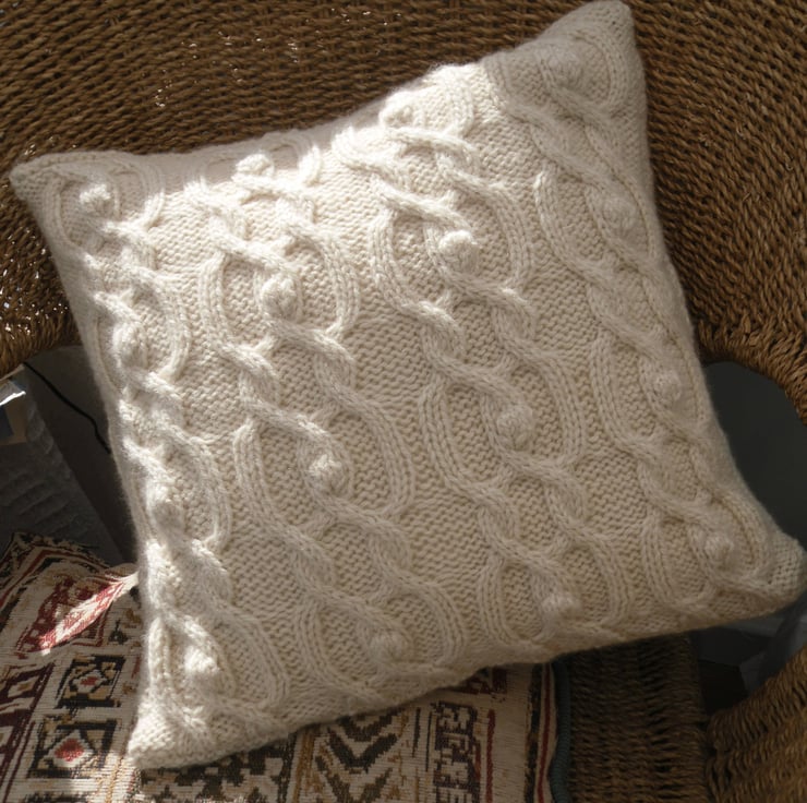 Knitting kit for a stunning cabled cushion cover. This is a beautifully soft, intricate cable cushion fitting a 14" x 14 cushion insert. Cables to the front of the cushion. A plain reverse stocking stitch back fastening with 5 wood buttons.