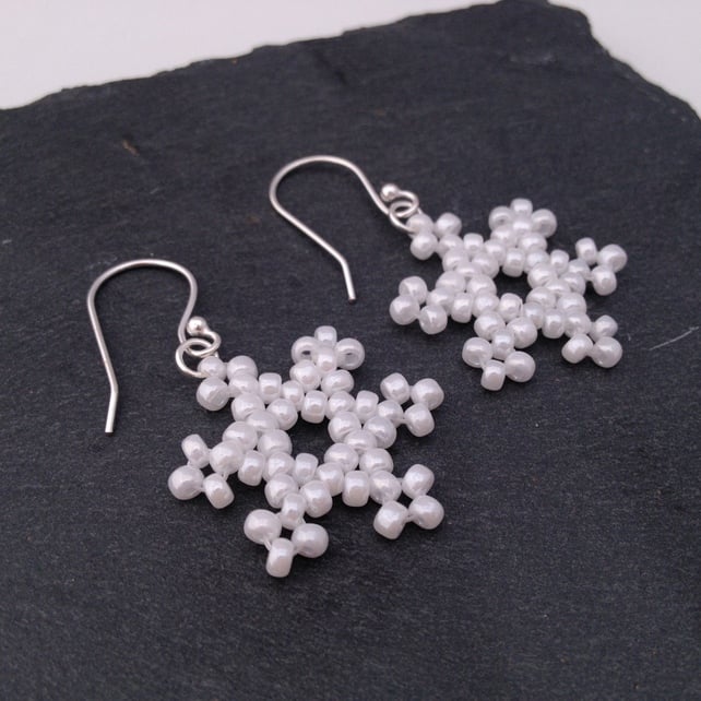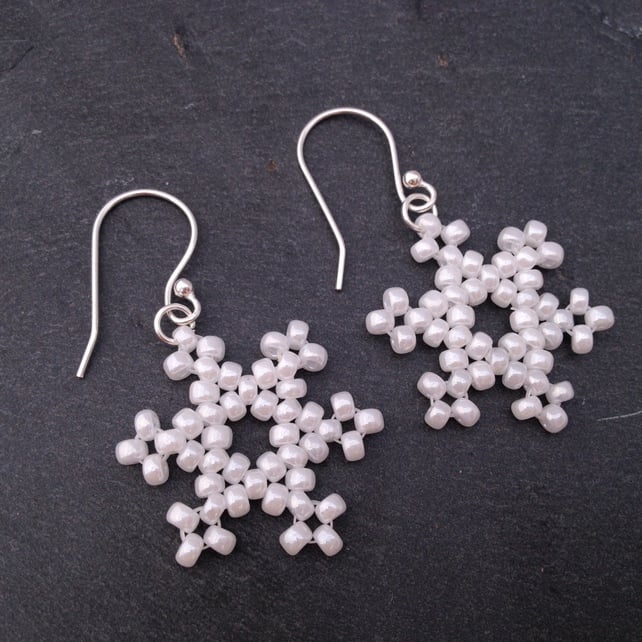 Made by hand sewing size 8/0 Miyuki seed beads in white pearl Ceylon to form a snowflake shape. I have then re-sewn through the whole snowflake to give it extra strength.