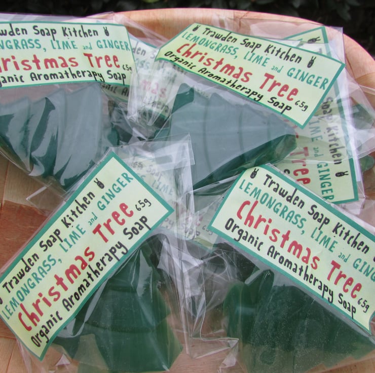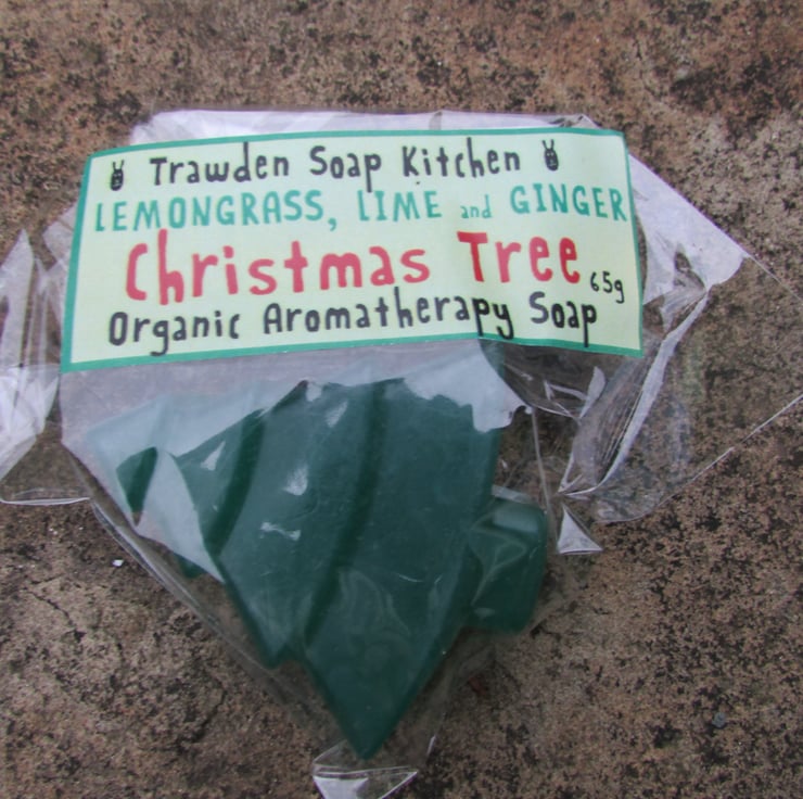 Christmas tree soap made from 80% Organic Soap, scented with a blend of Lemongrass, Lime and Ginger essential oils. Skin friendly with lots of moisturising glycerine and free from SLS, Parabens and artificial fragrance - all known skin irritants. Each soap is approximately 65g & is festively packaged. This listing is for one soap. See all photos