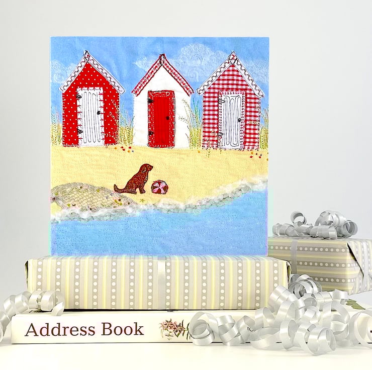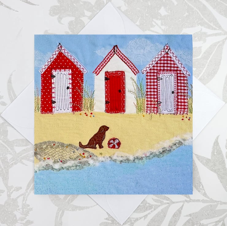 Beach Hut (trio of red huts) birthday card, showing a blustery day and a little dog on the sands. Reproduced from one of Heidi Meier's original textile embroideries.