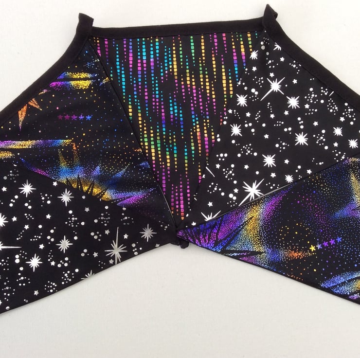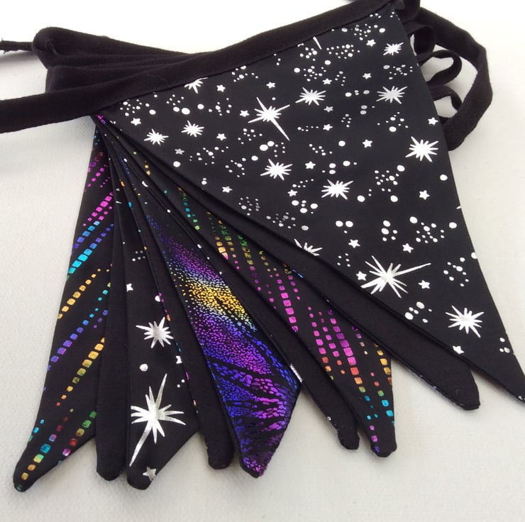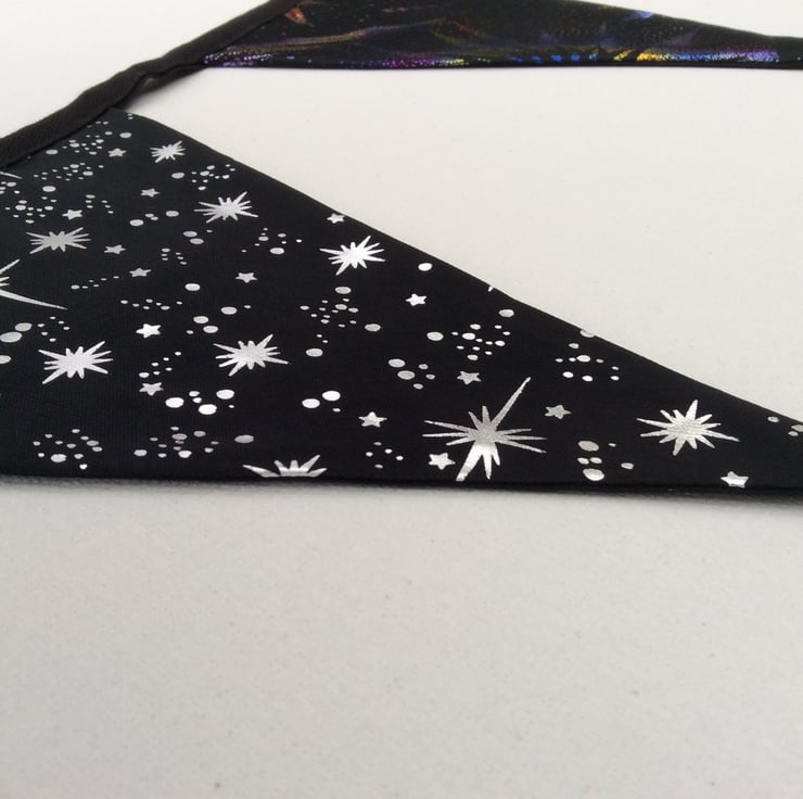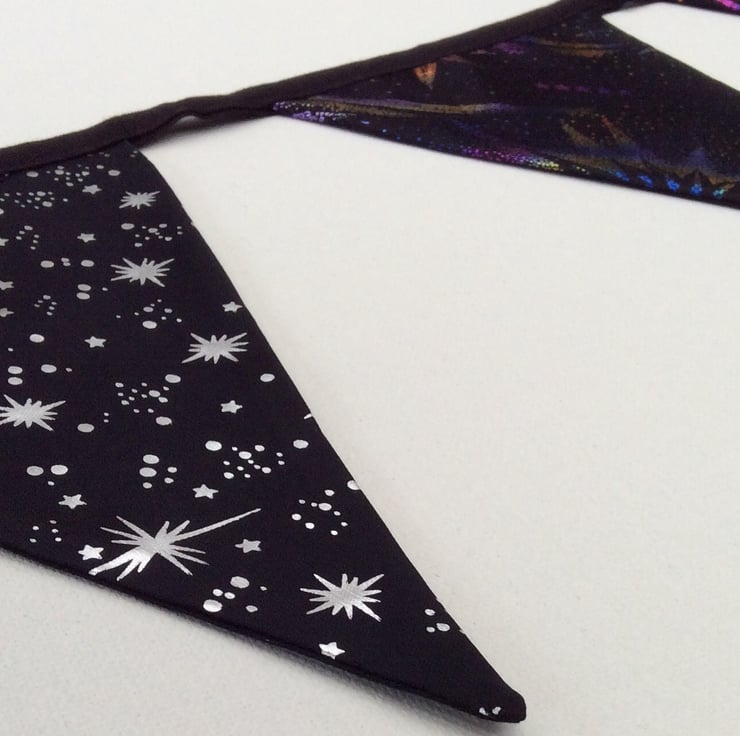 Bunting in a Space Galaxy Design handmade using silver stars and sparkly swirl fabrics. The light catches the sparkly colours in this Space themed bunting