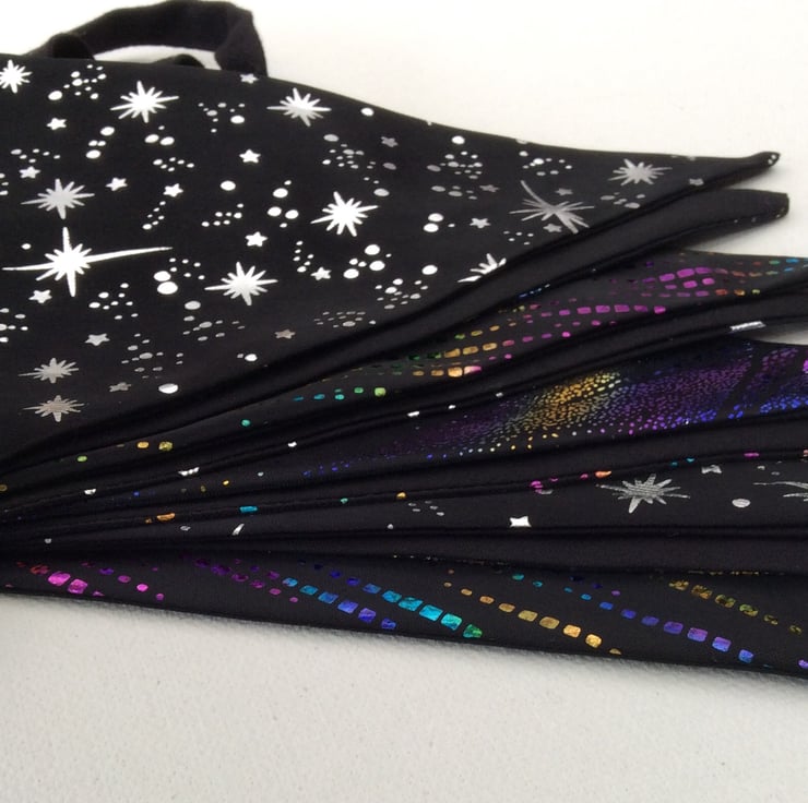 The front of the flags have been made using a variety of shiny satin fabrics with stars, sparkly rain effect and swirly vortex purples and golds. There are 9 double sided flags, each satin flag has been stitched to a plain black cotton backing , the fabric has been turned through and pressed to form a neat finish.