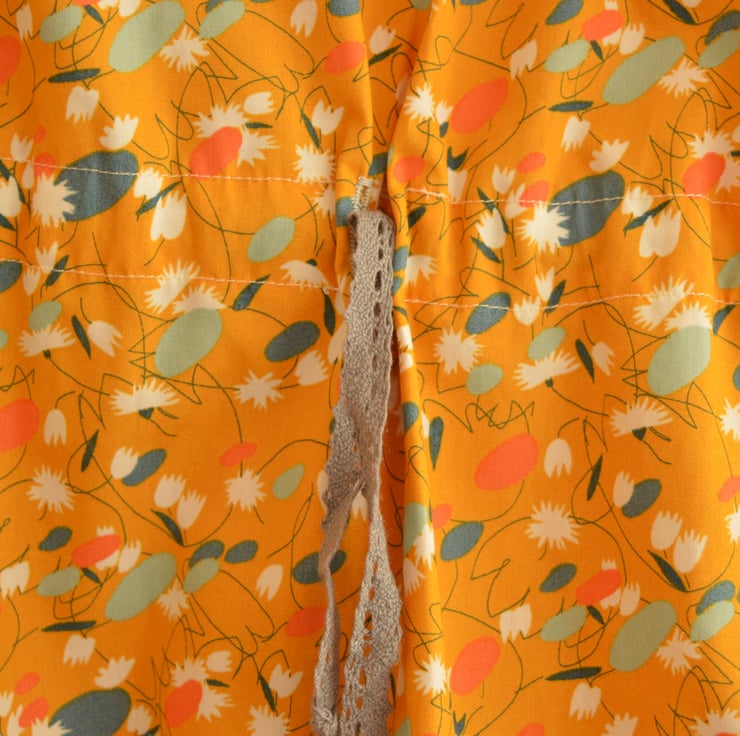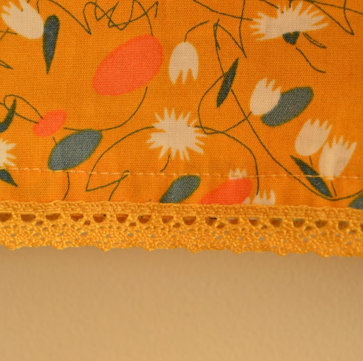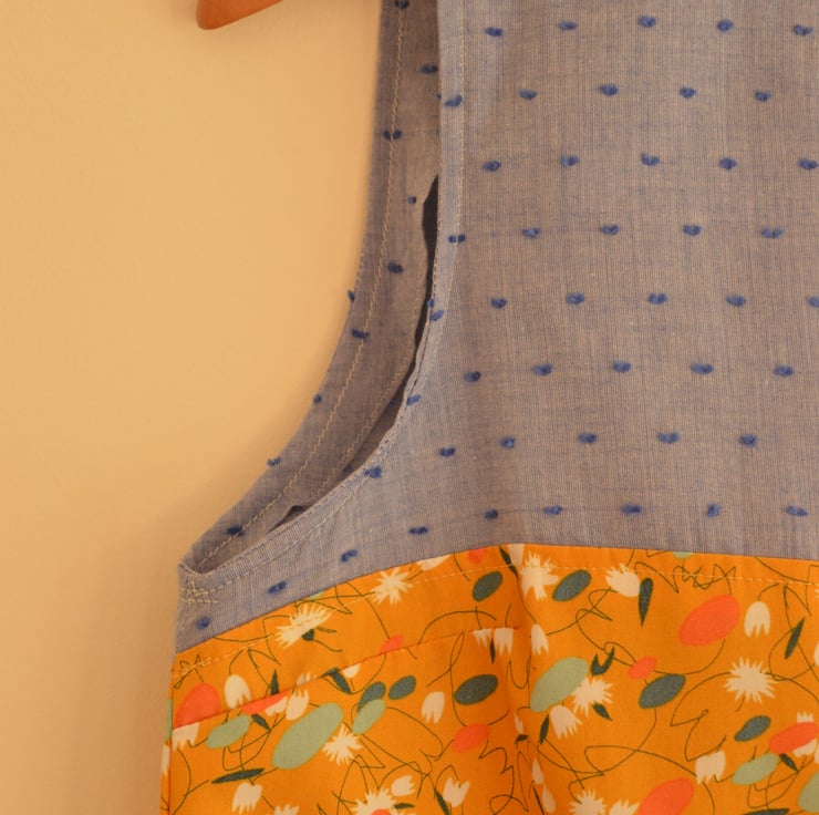 Contrast fabric in mustardy yellow fabric (Scandi spots, John Lewis) with blue/grey/orange/white pattern.