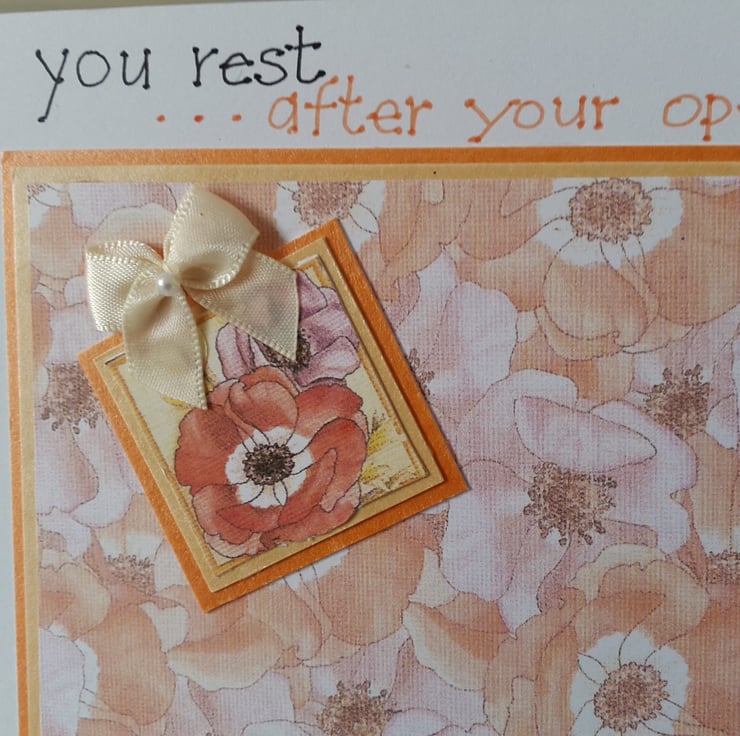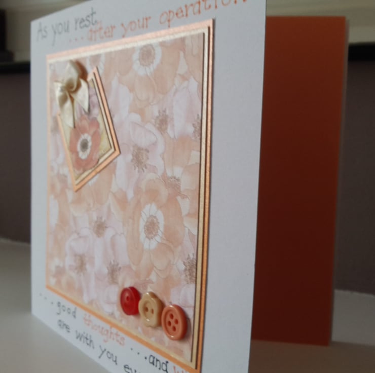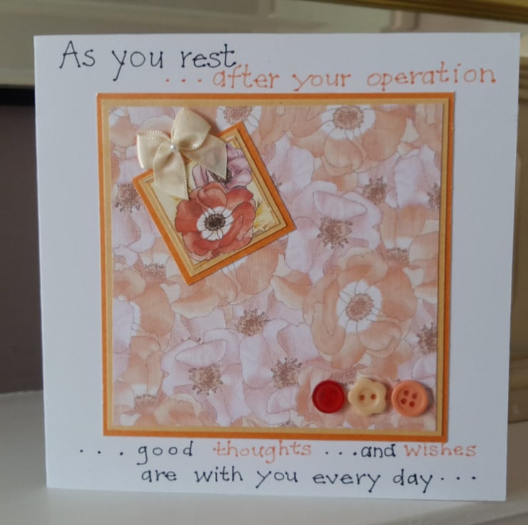 A completely handmade and uniquely designed card. Consisting of a pretty printed design of anemones mounted onto gold then orange and then onto quality pristine white card. An anemone has been highlighted and decorated with a cream ribbon bow. Three co ordinating buttons added. Finished off with the words 'as you rest after your operation, good thoughts and wishes are with you every day