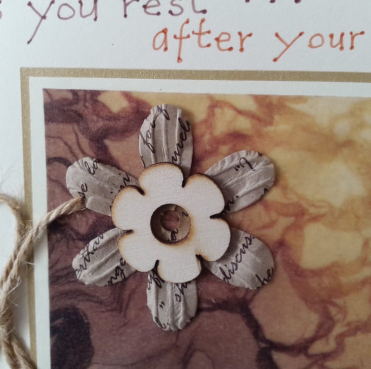 A completely handmade and uniquely designed card. Consisting of an unusual patterned printed vellum. This has been decorated with a brown flower with wooden centre. Mounted onto cream then gold card and then onto quality pristine cream card. A twine how bad been added and the words 'as you rest after your operation, good thoughts and wishes are with you every day