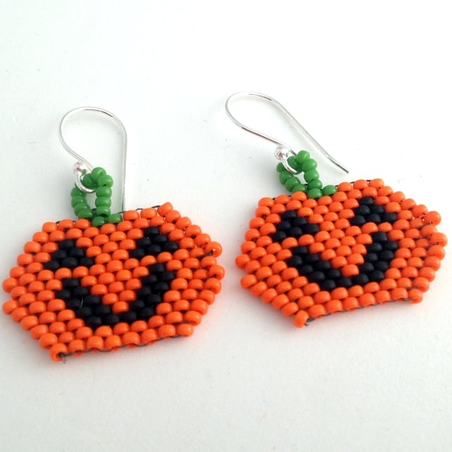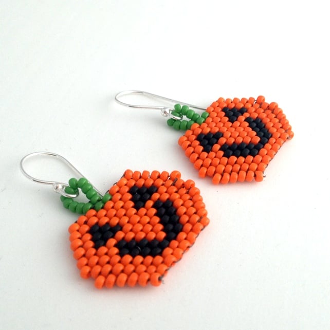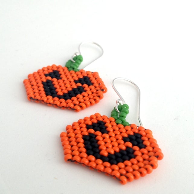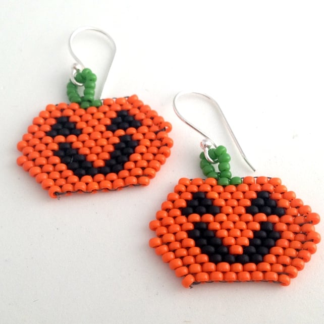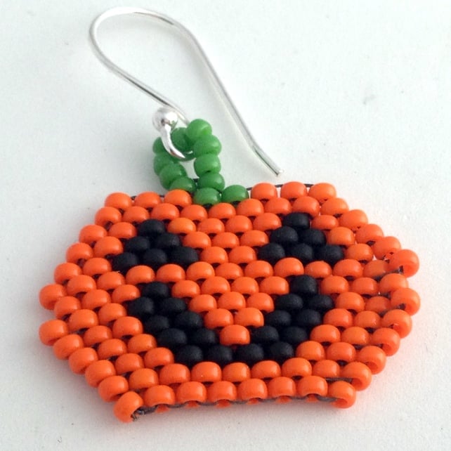 Made by hand sewing orange, black and green size 11/0 Miyuki seed beads together to form the pumpkin face and his happy features.
