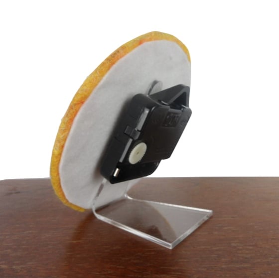 This lovely gift boxed desk clock has been made using a beautiful piece of nuno felt made using a yellow blend of merino wool felted to an orange silk chiffon fabric. This nuno felt has been mounted on a plywood clock face and black hands and hour markers have been added. The clock has a battery powered quartz movement and has a clear acrylic stand added allowing it to be free standing on a desk or mantlepiece. The reverse of the clock has been covered with a piece of white commercial felt.