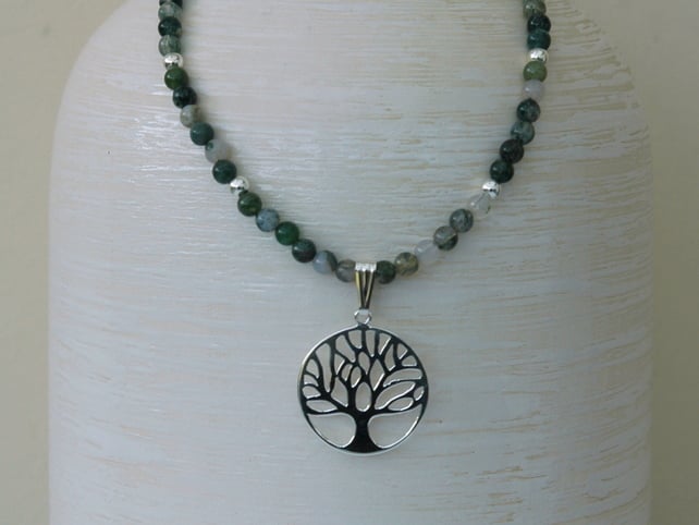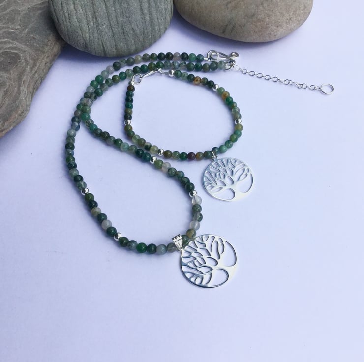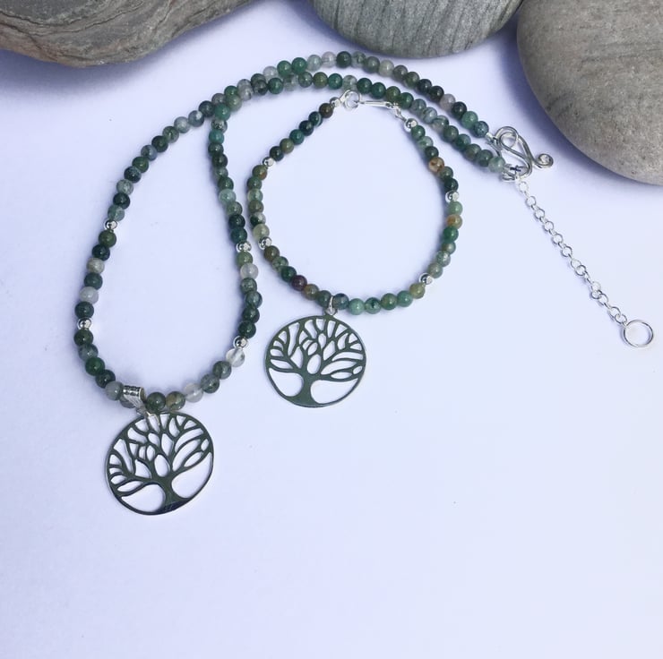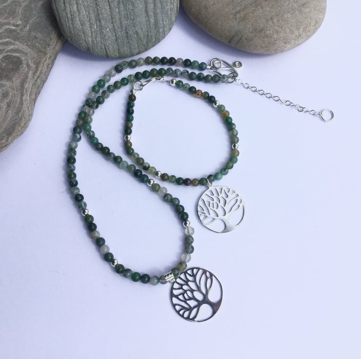 This pretty two piece jewellery set includes a necklace and bracelet, each featuring a sparkling sterling silver filigree tree of life charm, complemented by green moss agate gemstones. The two items are available separately but the price of the set represents a discount of £15 compared to the individual listings. The stones are in muted shades from very pale greenish-white to a dark moss green, with hints of gold here and there. I have added sterling silver beads to bring sunlight and sparkle to the stones. The charm is attached to the necklace by a sterling silver clip-on bail which enables it to be removed easily. Both necklace and bracelet are fastened by means of elegant sterling silver clasps, hand made by me. The tree charms are stamped '925' for sterling.