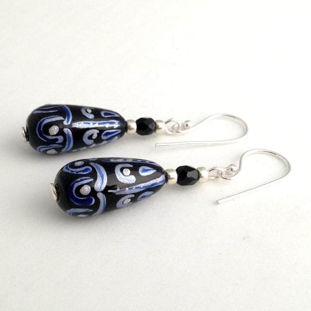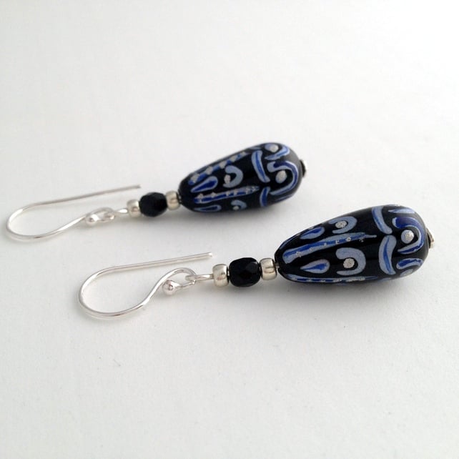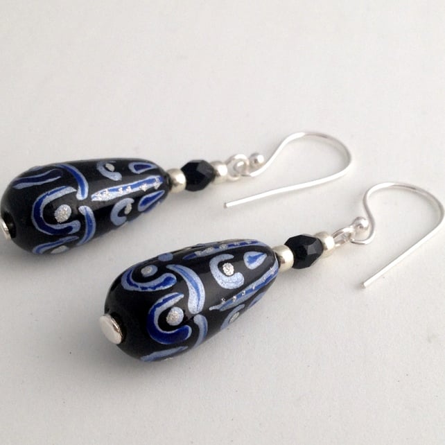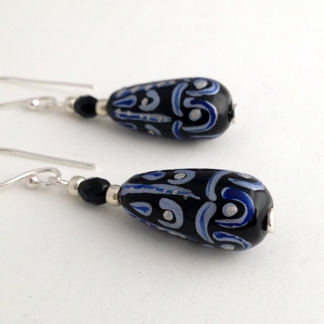 Each earring features a 20x9mm (at its widest point) glass elongated drop bead. The main colour of the bead is black and it has a pattern on it in blue and silver. To compliment the drop beads I have also added silver coloured seed beads and black fire polish beads as extra detail. The fire polish beads also add a little hint of sparkle to the earrings.