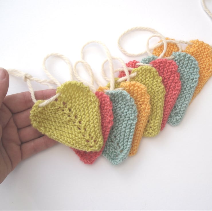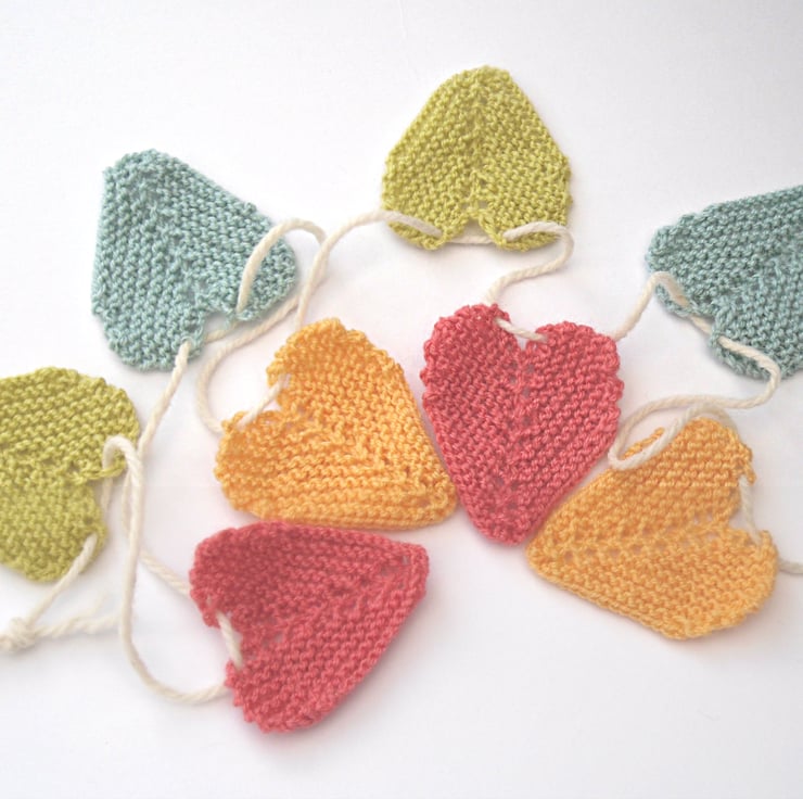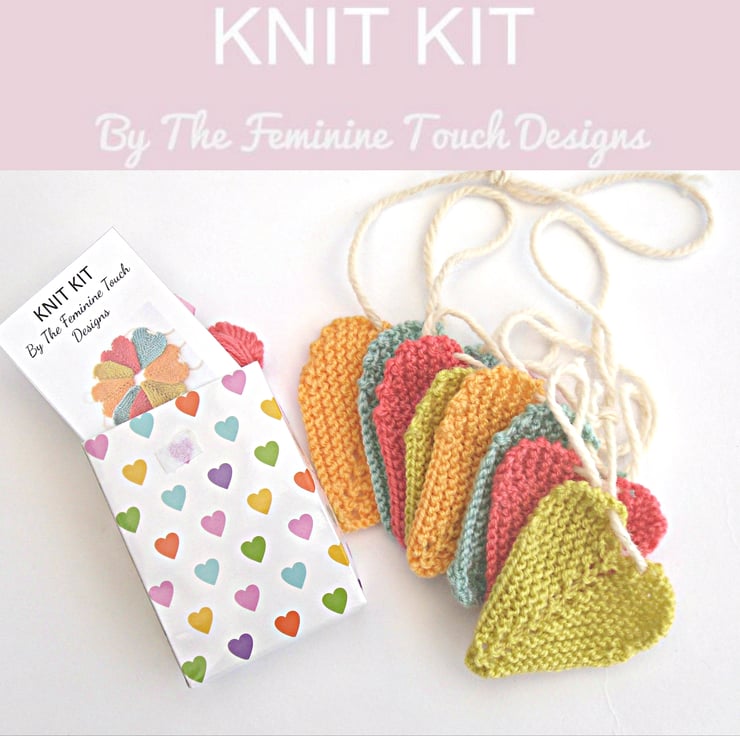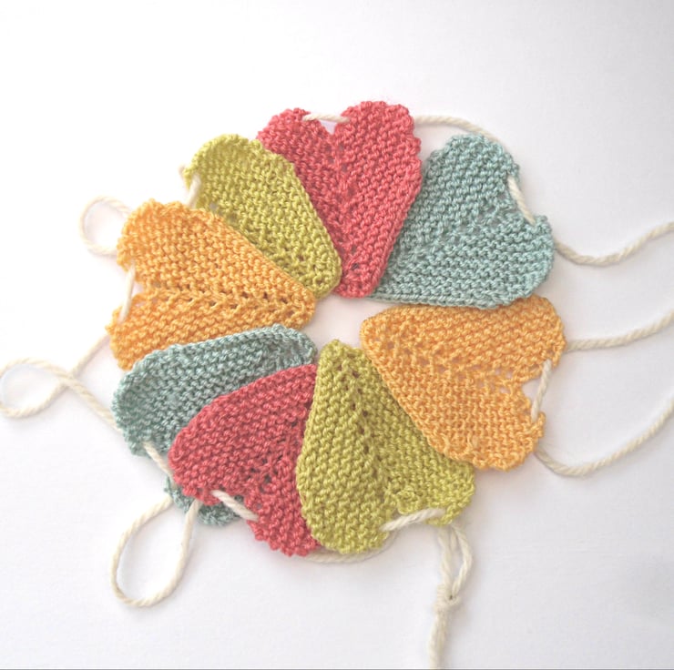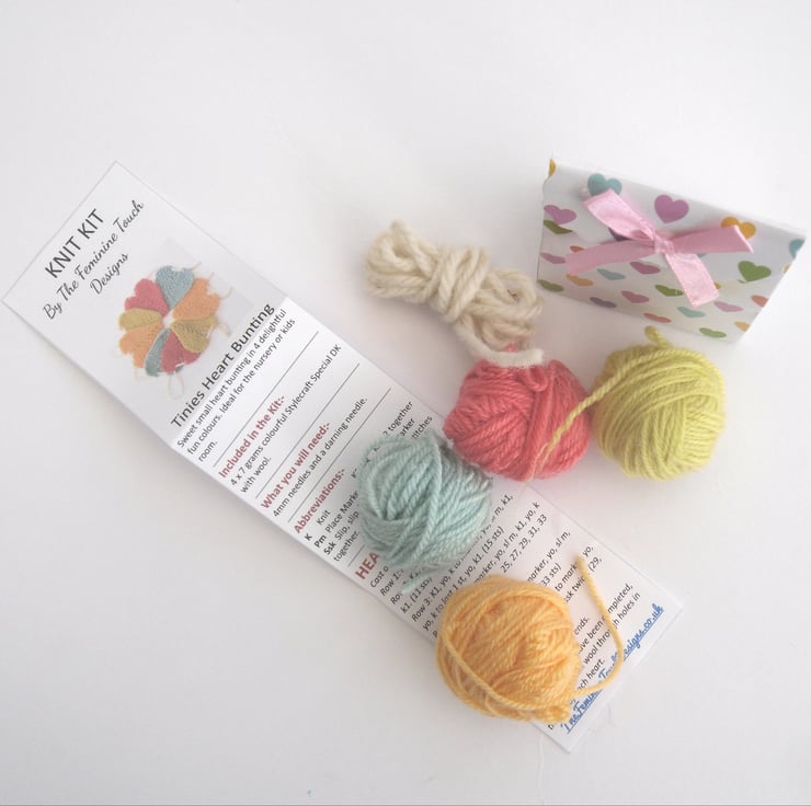 Knitting kit for Tinies Heart Bunting. Sweet small heart bunting in 4 delightful fun colours. Ideal for the nursery or kids room.