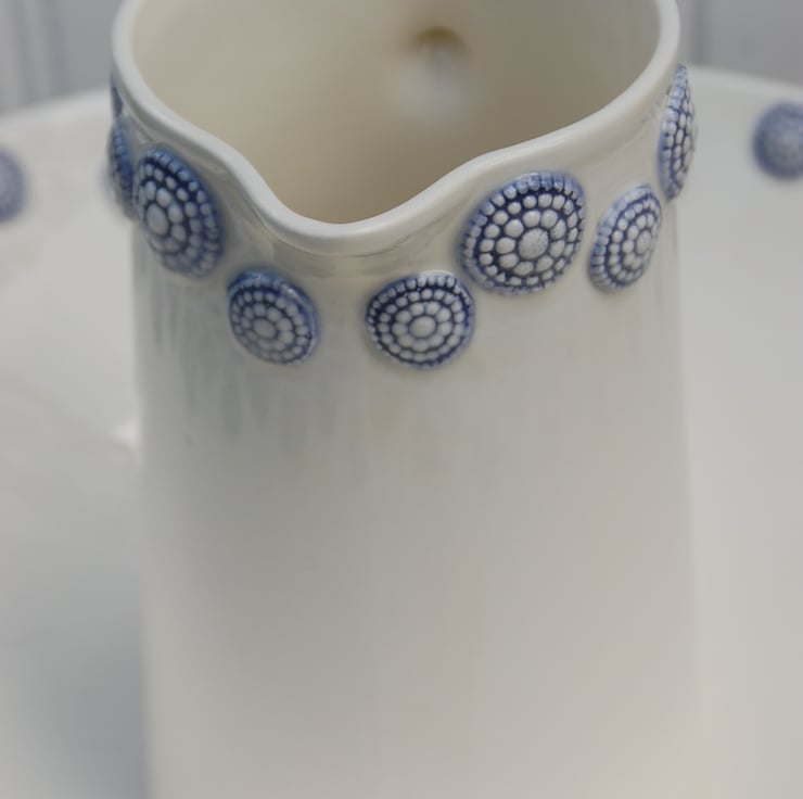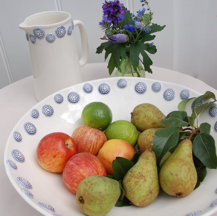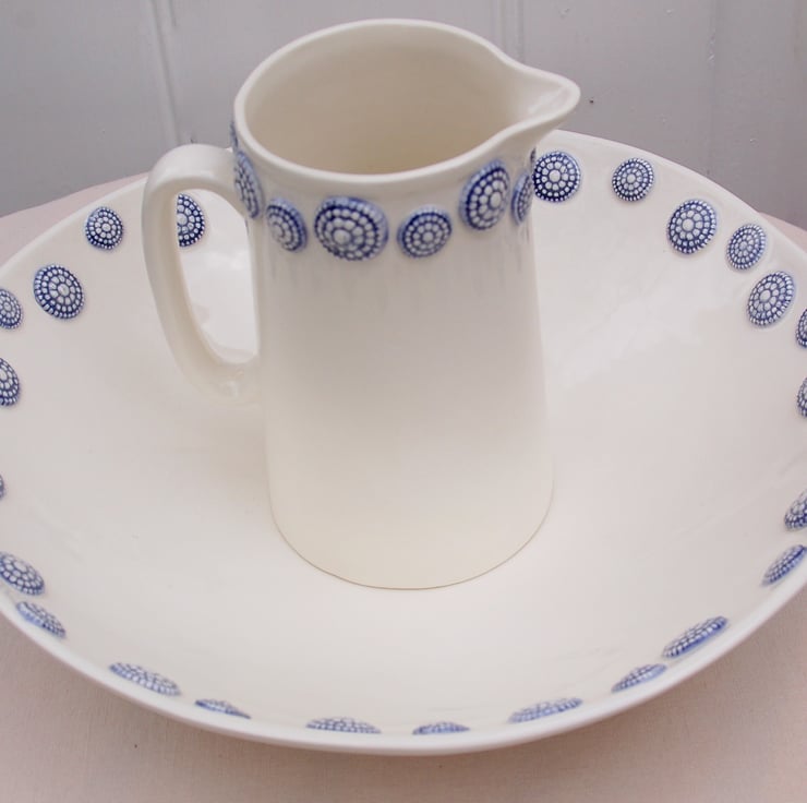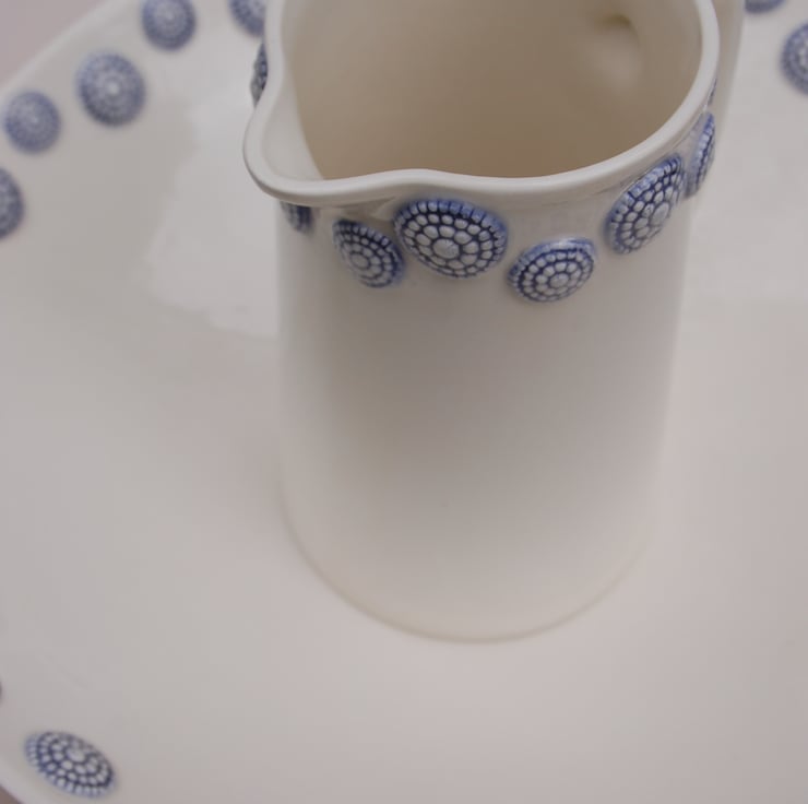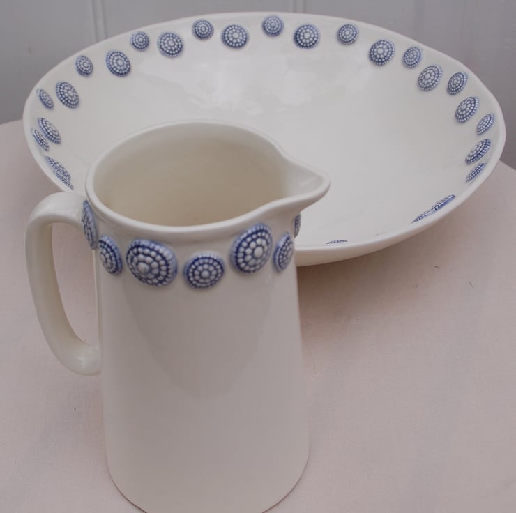 This is an elegant one off set. A large shallow dish and a two pint jug with applied circle sprig design around the rim. These are high fired slip cast earthenware and have been glazed with lead free glazes. I have made the sprig old and have hand applied the circle design to the preferred clay pieces.