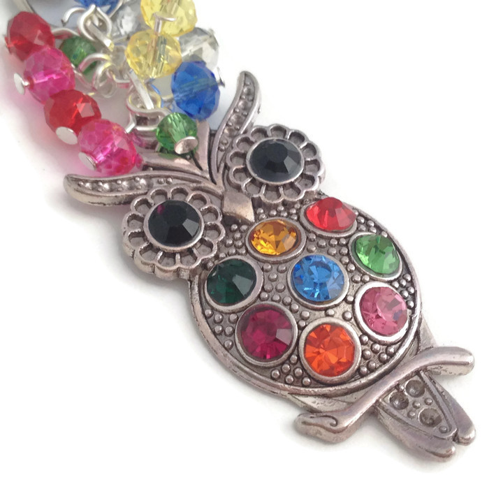 Featuring a 45x24mm owl charm that has been attached to a 15mm length of chain. I have also added to the chain glass rondelle beads in pink, red, clear, green, blue and yellow, to compliment the colours on the owl charm and to carry on the colourful theme.