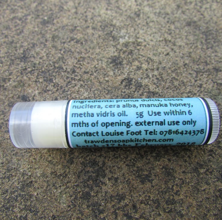 Beeswax, Manuka Honey. Selected for their nurturing and anti oxidant properties, these all natural ingredients soothe, protect and moisturise. A tiny amount of Spearmint essential oil is added - the taste is subtle.
