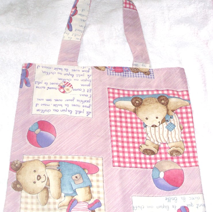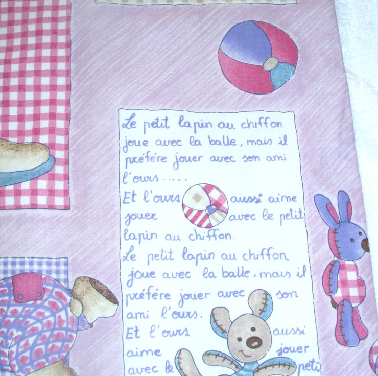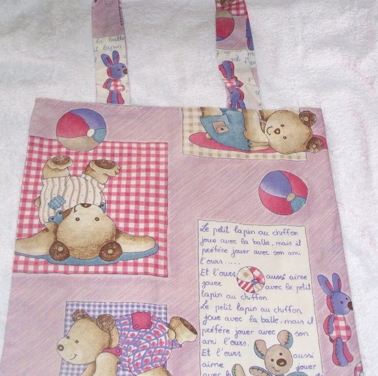 le petit Lapin au chiffon cloth bag with a little french rabbit and friends playing ball on a pale pink cloth bag. very comfortable to carry with fabric handles , fully lined with cotton fabric, ideal for carrying shopping .also useful as an overnight bag for all those essential items or as hand luggage when travelling , will hold for example : a wash bag , a book . it measures approx 42m x 42cm .