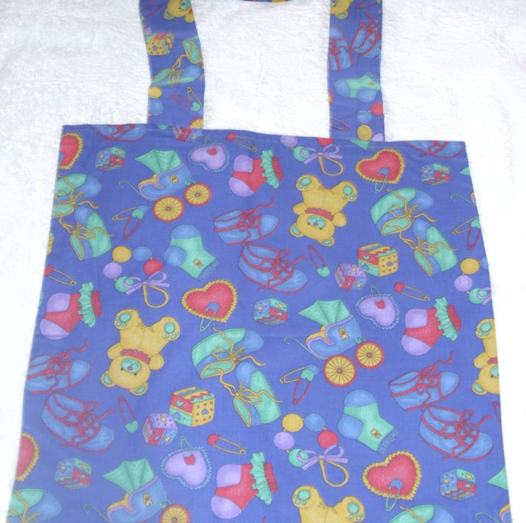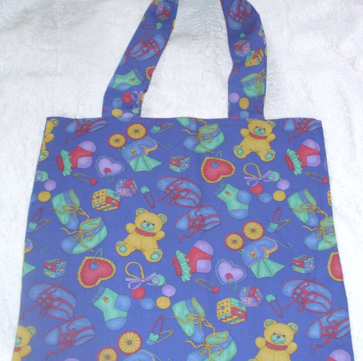 cloth bag with all sorts of baby toys, booties, teddies, nappy pins, socks, building blocks tossed all over a rich purple background, very comfortable to carry with fabric handles , fully lined with cotton fabric, ideal for carrying shopping .also useful as an overnight bag for all those essential items or as hand luggage when travelling , will hold for example : a wash bag , a book . it measures approx 43m x 40cm .