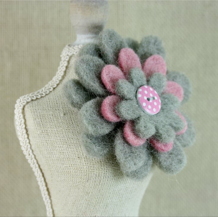 ...all hand stitched together to create this dark grey and and a hint of pink felt flower brooch.