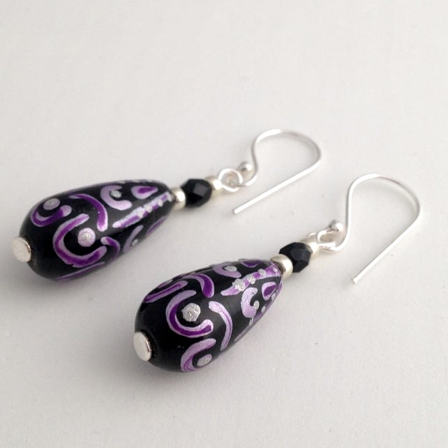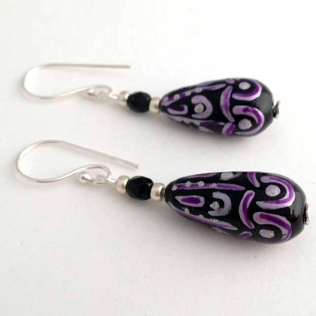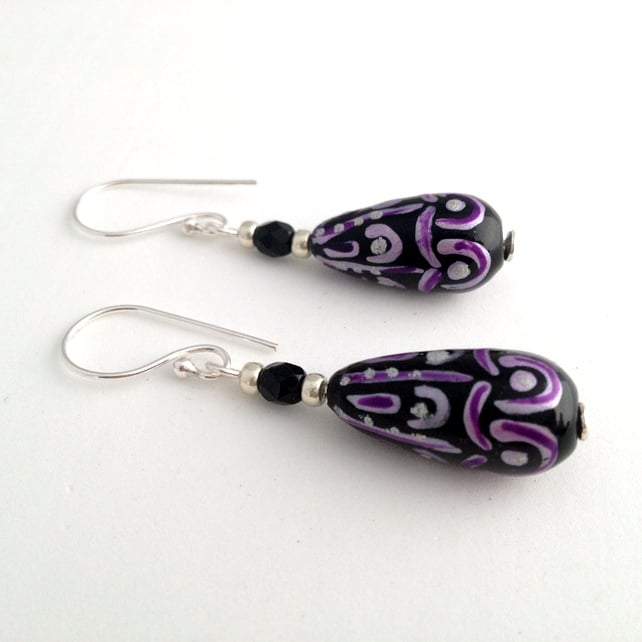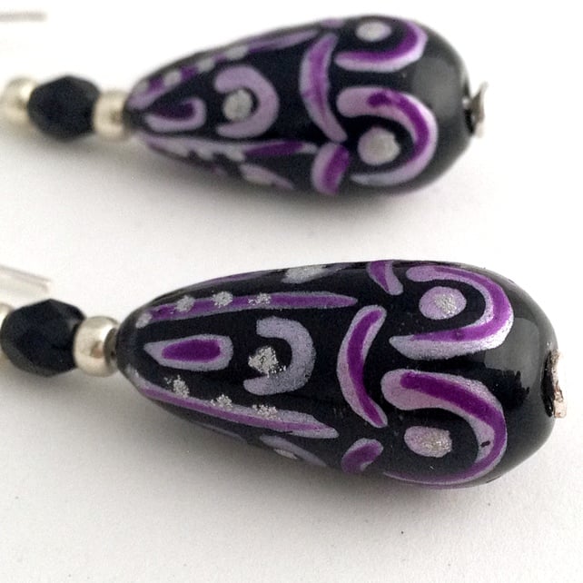 Each earring features a 20x9mm (at its widest point) glass elongated drop bead. The main colour of the bead is black and it has a pattern on it in purple and silver. To compliment the drop beads I have also added silver coloured seed beads and black fire polish beads as extra detail. The fire polish beads also add a little hint of sparkle to the earrings.