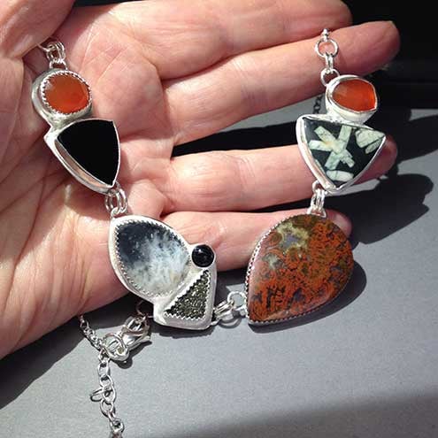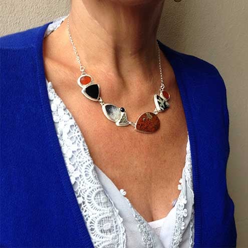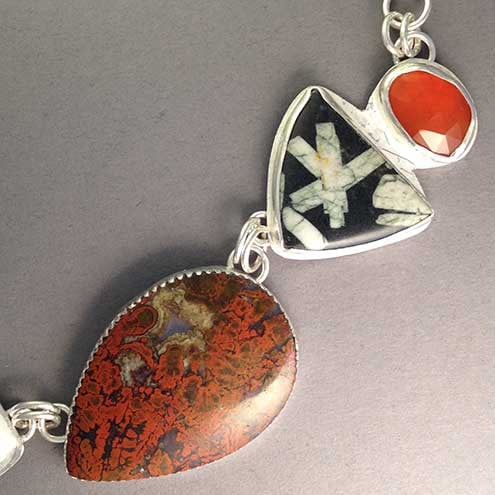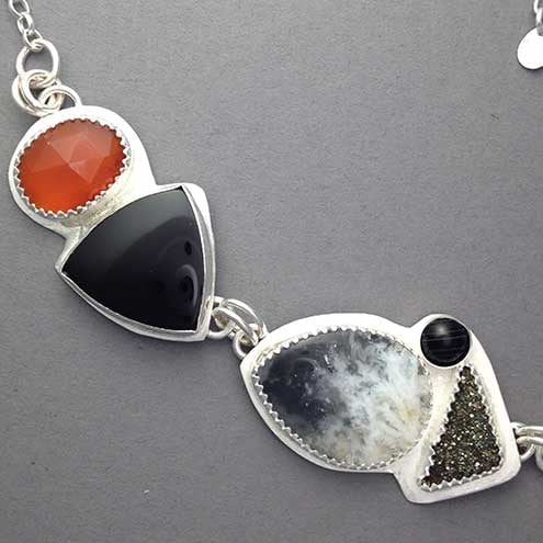 This striking one of a kind necklace contains a collection of stones that are a stylish combination of black, white and orange/red. It doesnt have a focal stone but is like a Mazurka. (read more in the Inpiration section)