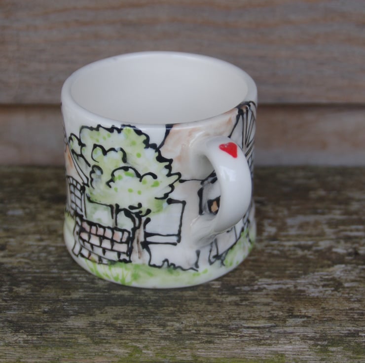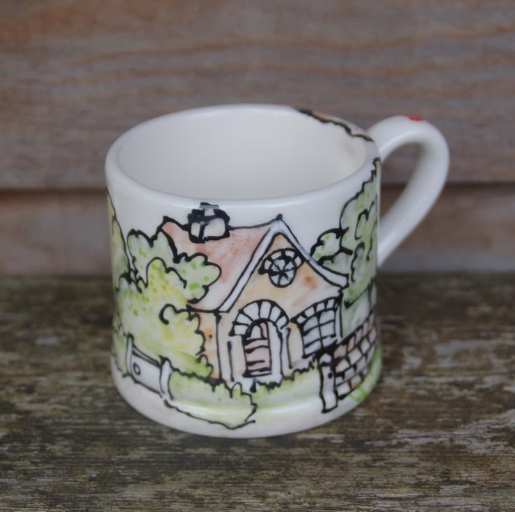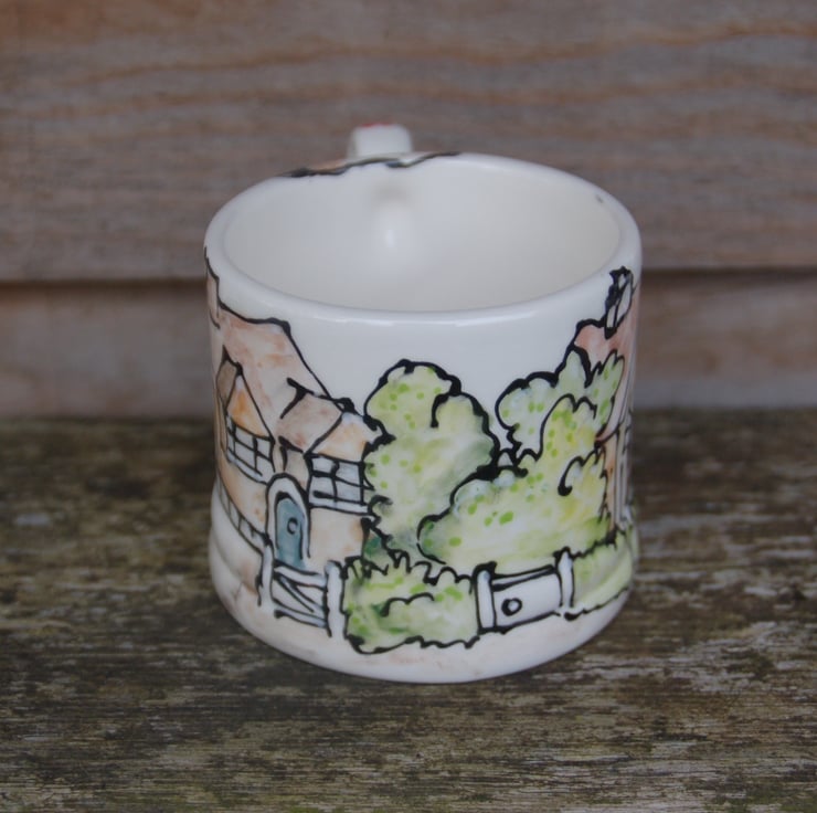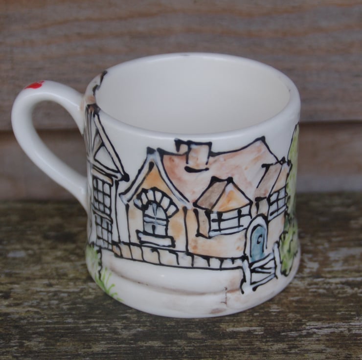 Such a cute little mug, with a story book style illustration of a village street running round it. It is painted in food safe underglaze colours and fired to high earthenware temperatures using lead free glaze.