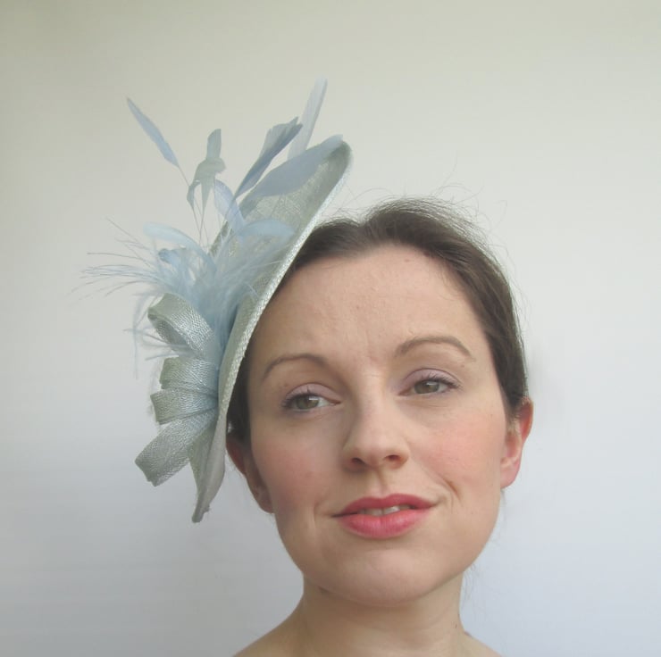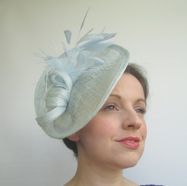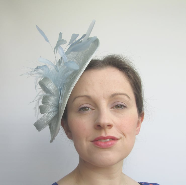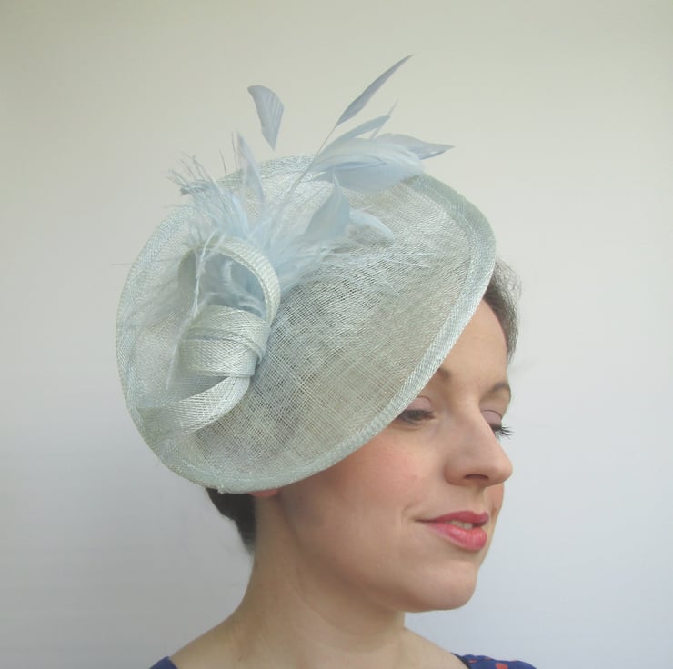 Ladies pale blue hatinator for weddings, races, tea parties, christenings etc. Each hat is handmade in sinamay fabric before trimming with millinery feathers and sinamay 'bow' for a very feminine and glamorous look.
