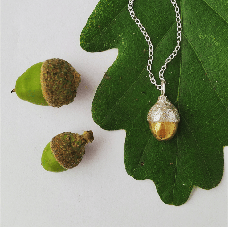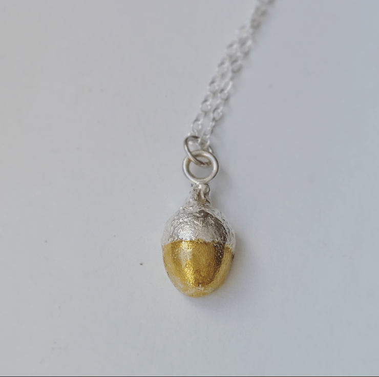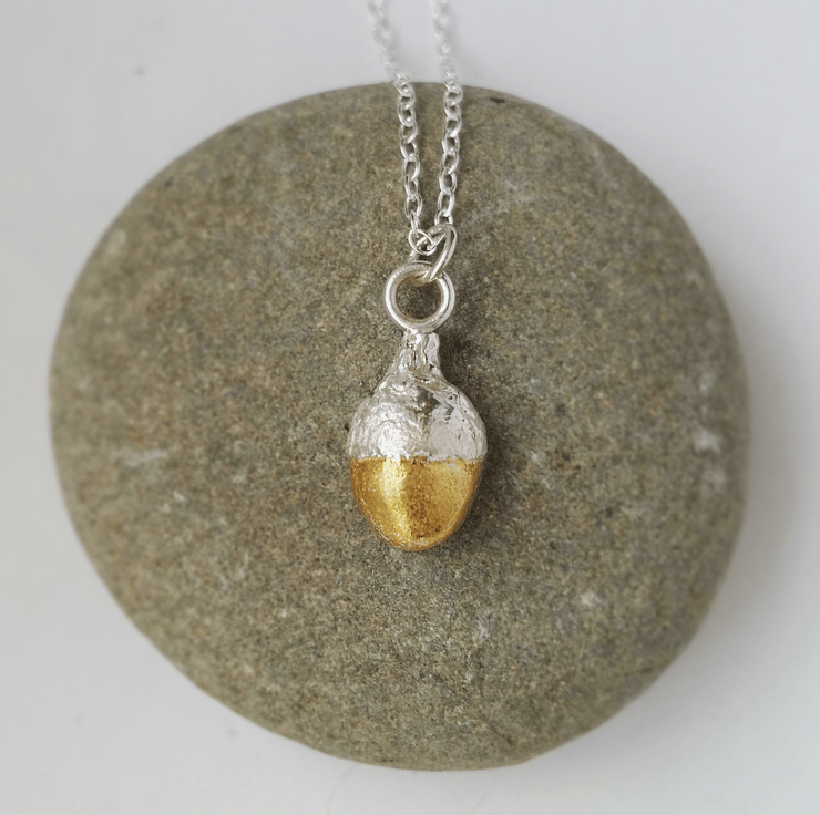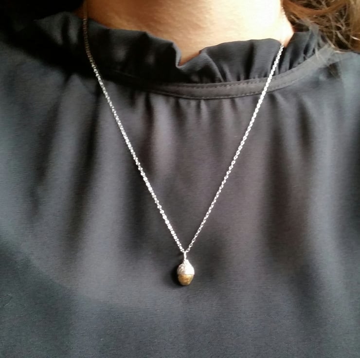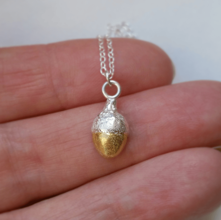 This is a really pretty fine silver acorn necklace on a sterling silver 18" chain. This cute little acorn has been cast from a tiny acorn I found on a Sunday morning walk through the woods. The bottom half of the acorn has been accented with a rich 24ct gold to reflect beautiful Autumn colours.