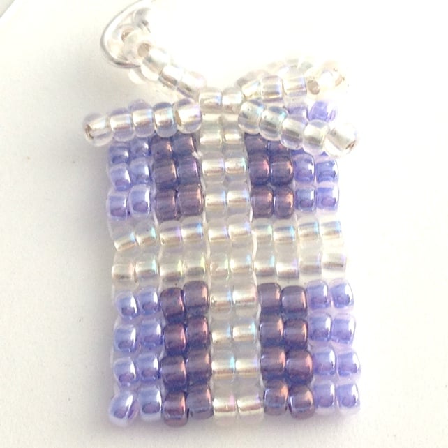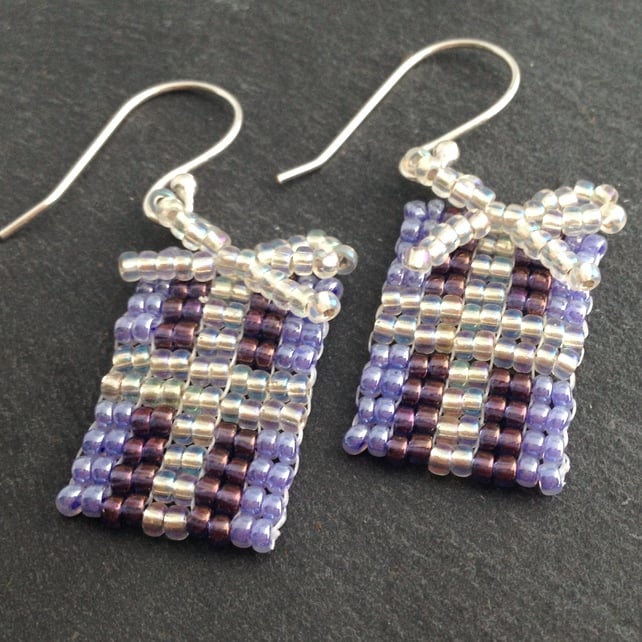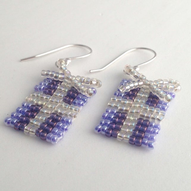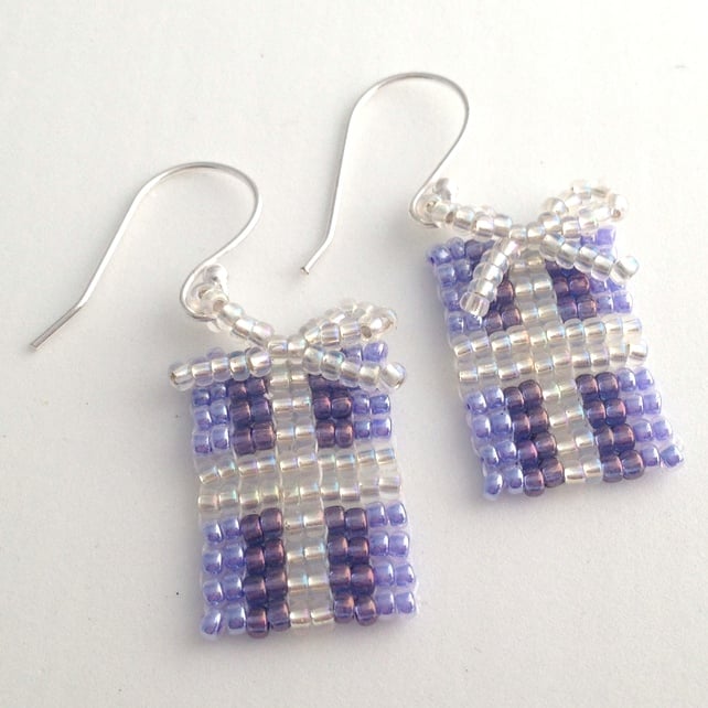 Made by hand sewing size 11/0 Miyuki seed beads in purples and crystal ab to form a Christmas present shape. I have then created a bow out of the crystal ab seed beads that finishes off the top of the present. All of the beadwork has been sewn through twice to give each earring added strength and durability.