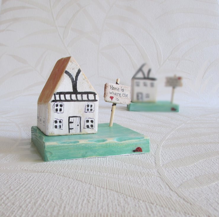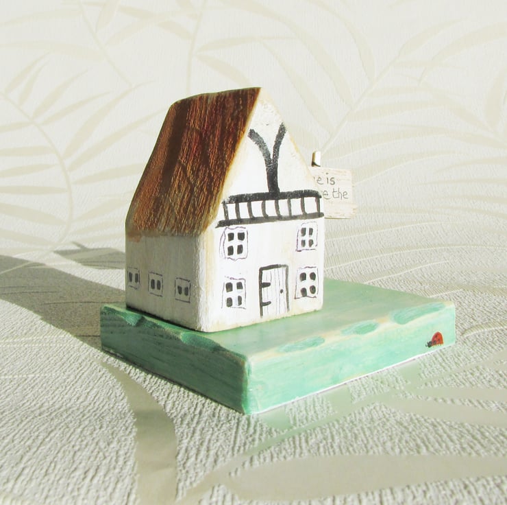 A Tudor style house with a sign saying Home Sweet Home and a little ladybird painted on the base. The House has been painted on all 4 sides.