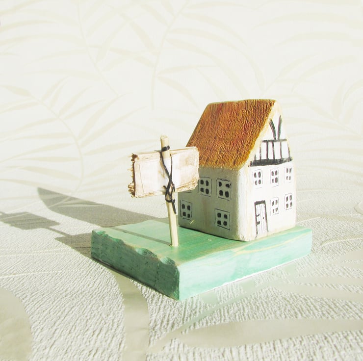 A Little Wooden Tudor Style House, comes on it's own base and a wooden sign.