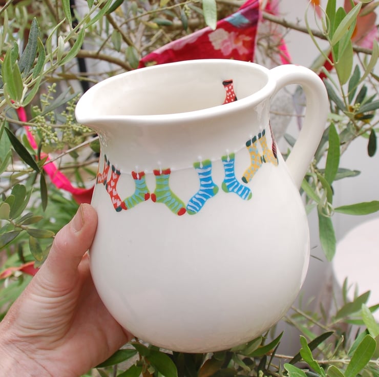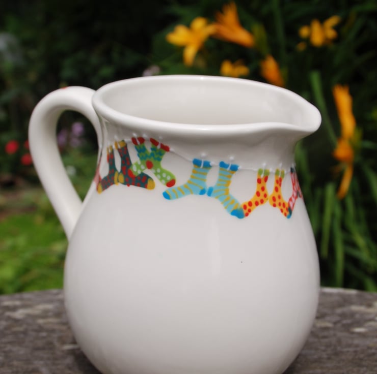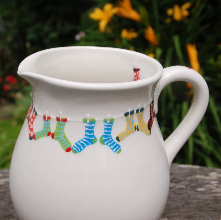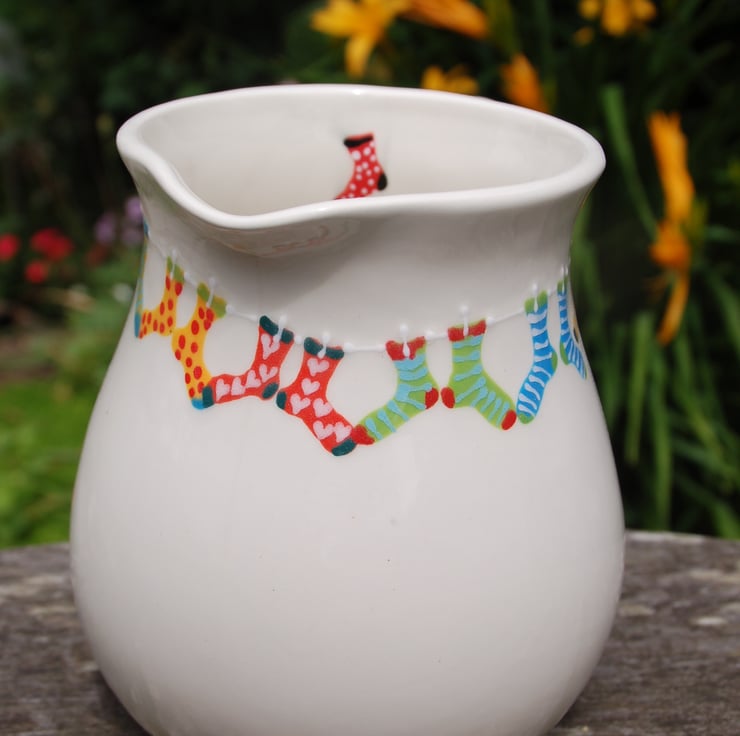 Quirky is as quirky does....hand painted high fired earthenware jug painted with socks on a washing line - with a rogue spare on the inside of the jug of course.