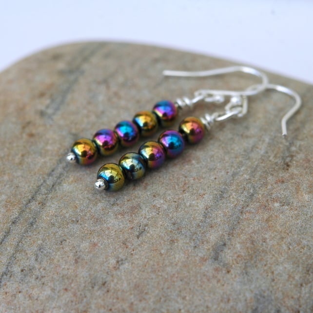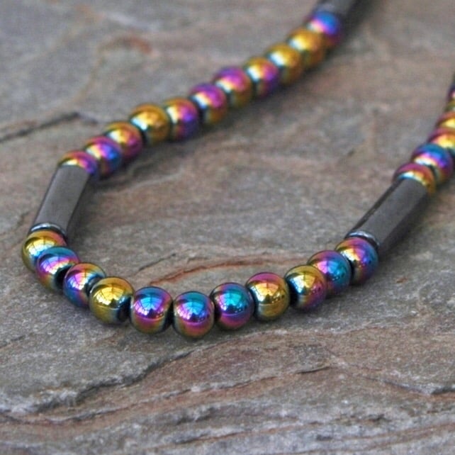 This magical gemstone necklace and earring set features round beads of semi-precious haematite which have been electroplated with a metallic finish that reflects all the colours of the rainbow! It could be worn with almost any colour. The beads are 4mm in diameter and are interspersed with dark gunmetal grey haematite tube beads measuring 4x13mm. The necklace is 44cm, 171/2 inches long and fastened with a sterling silver bolt and ring clasp. The matching earrings have a drop of 2.5cm, 1 inch below the hook. The beads are mounted on sterling silver head pins and dangle from elegant ear hooks stamped 925 for sterling.