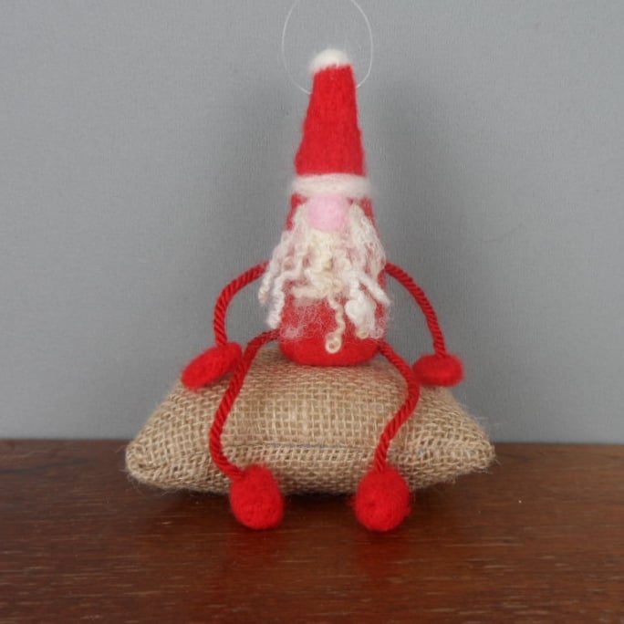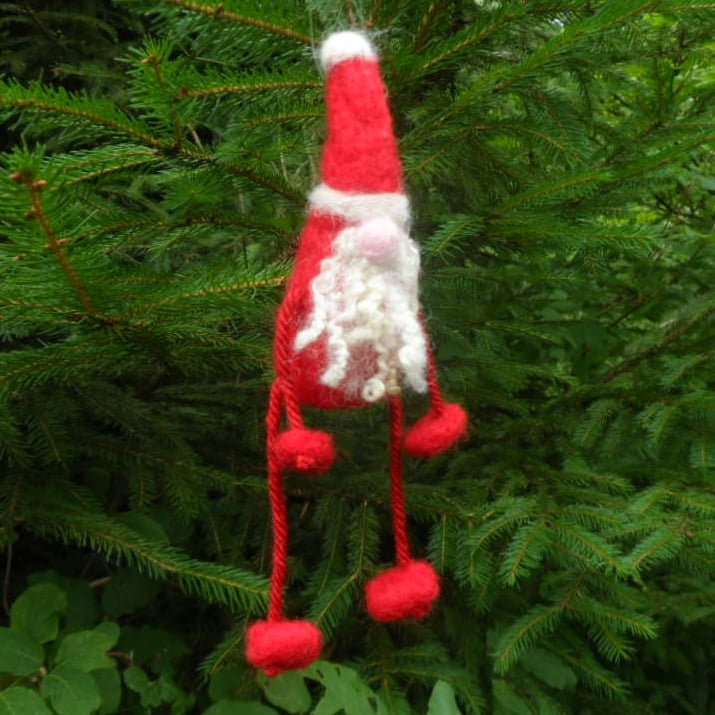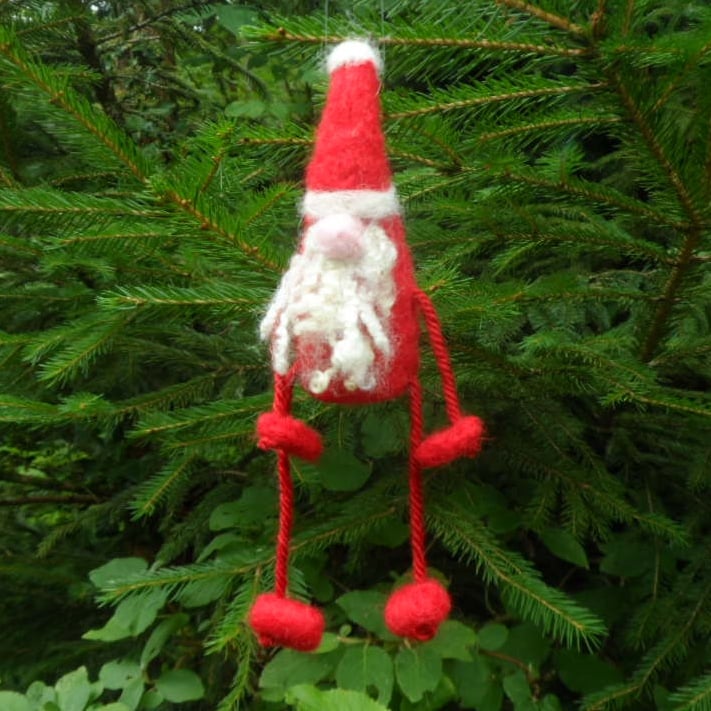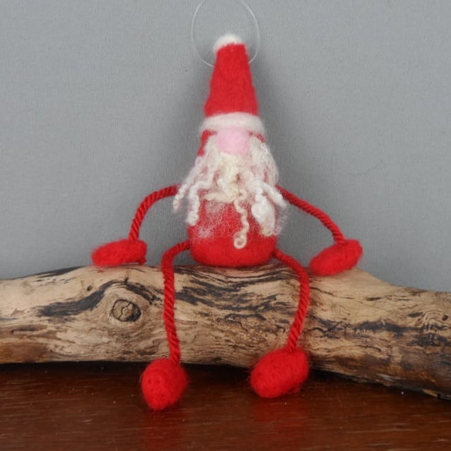 This body, hands and feet of this Father Christmas decoration have been needle felted using perendale and merino wool in red and white. A pink merino wool nose and a beard using curly wool locks have been added. His arms and legs made from acrylic yarn. The result is an adorable santa decoration. The main body measures approximately 10cm (4"), 17cm (6.5") tall including legs