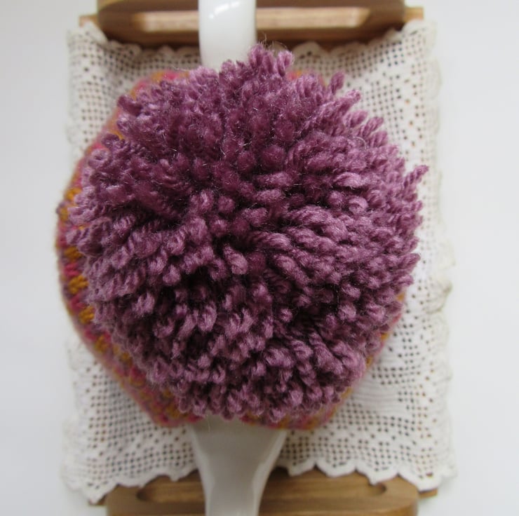 Nestling on the top is an oversized pompom, in the co-ordinating plum coloured yarn.