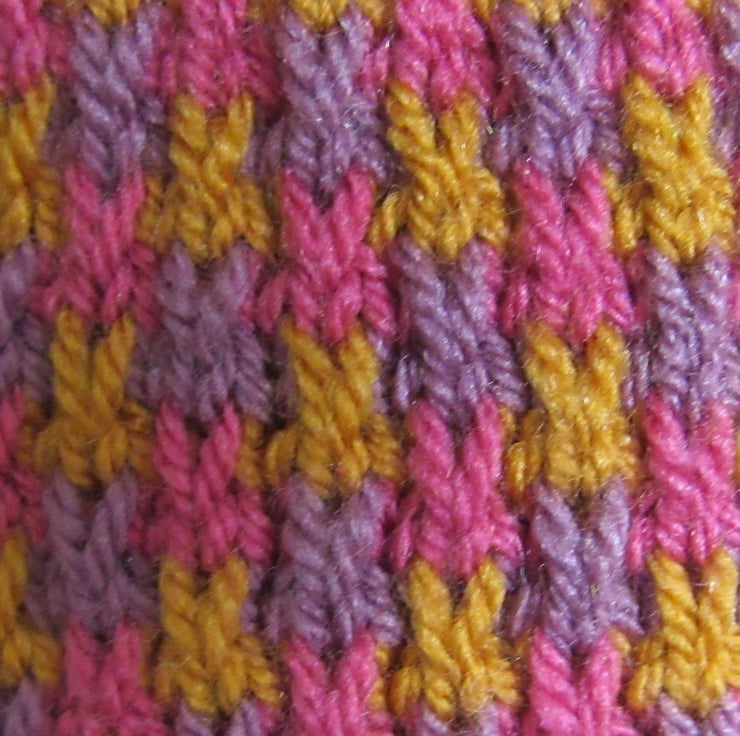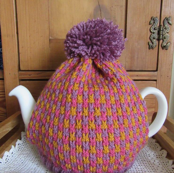 Then using three different coloured yarns; juicy plum, ochre and crushed raspberry, I have knitted a wonderful tweed stitch tea cosie body.