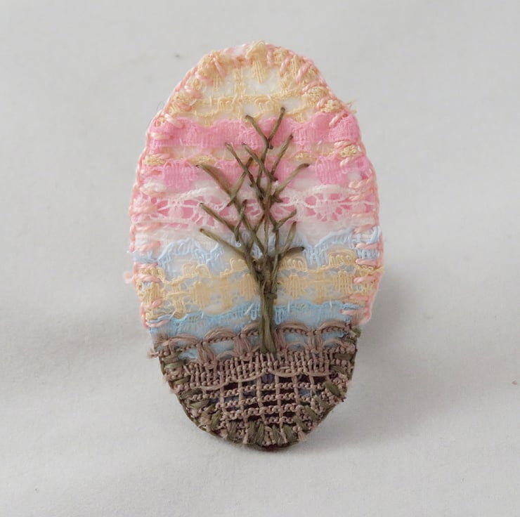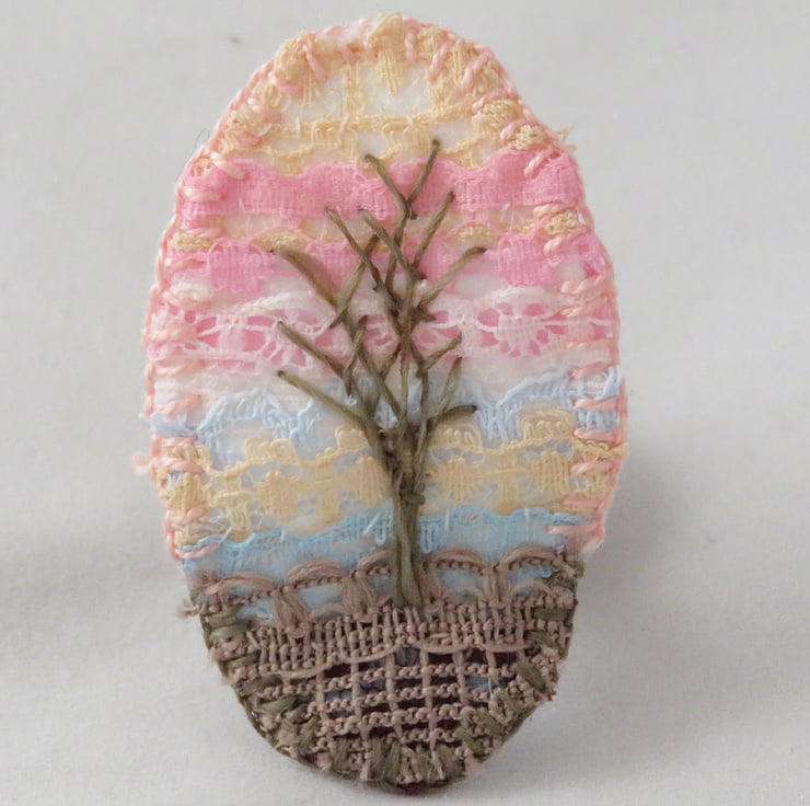 Scraps of lace have been layered and hand-stitched over a background of white felt. A tiny tree has been hand-stitched in coordinating linen thread. The completed design has been reinforced by a layer of interfacing. The design has been finished by stitching over the edge in blanket stitch using coordinating cotton threads. The back of the brooch is neatened by a layer of felt and a brooch pin is securely stitched in place.