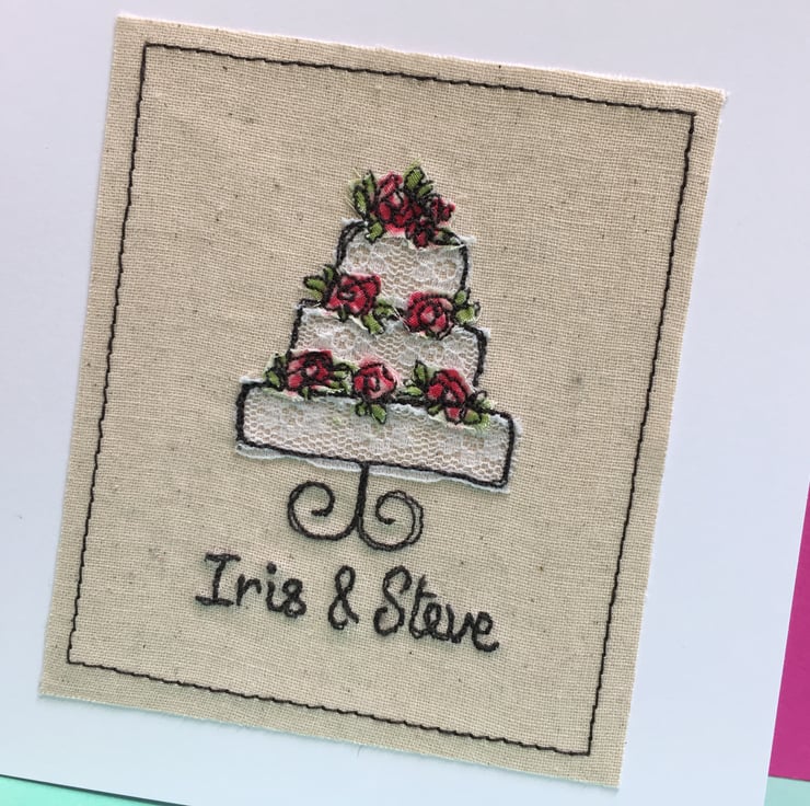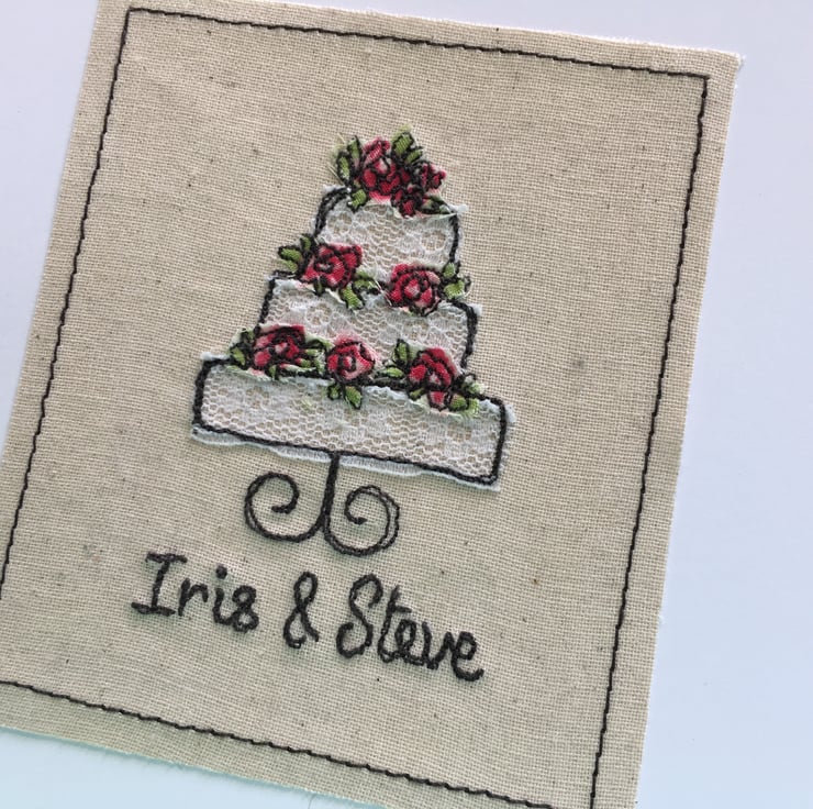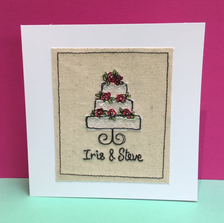 This shabby chic wedding card of an delicately embroidered Lace wedding cake with flowers makes a beautiful and personal card for the happy couple! The bride and grooms' names are embroidered onto the card, or any other personal message you would like me to add!