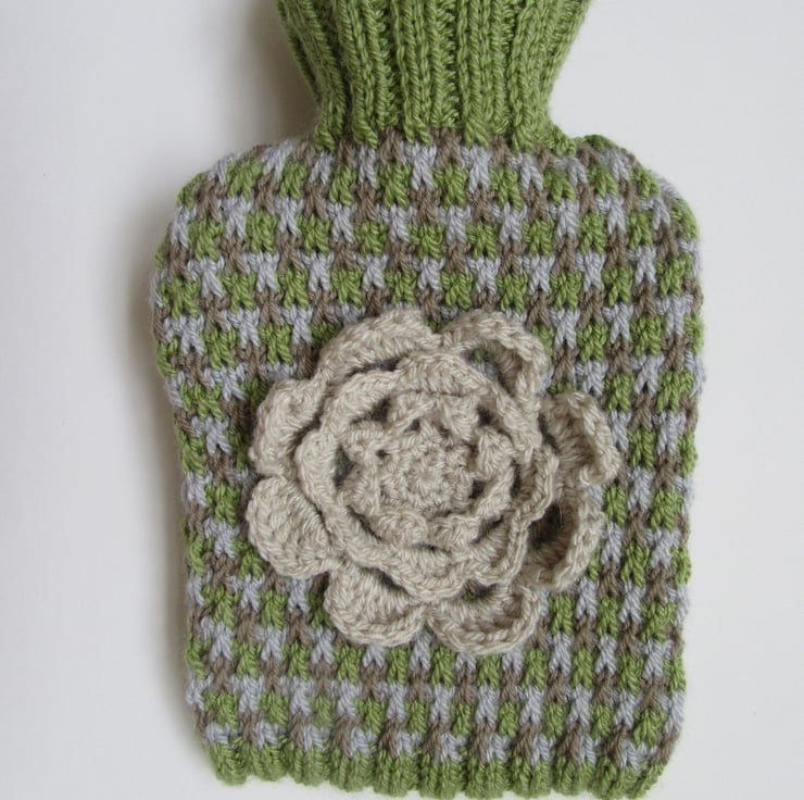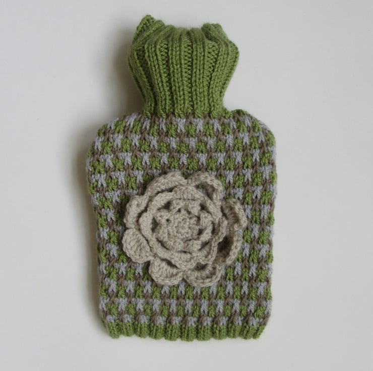 A hand knitted tweed hot water bottle cover in mossy earthy colours.
