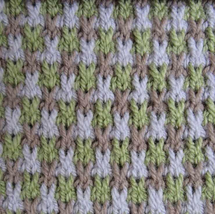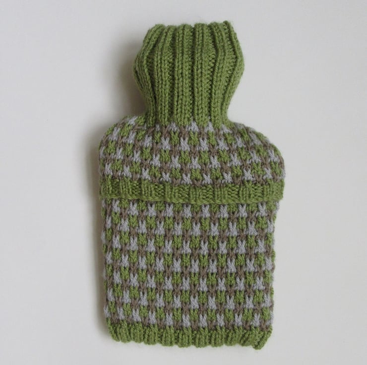 The body of the hottie is knitted in a tweed stitch, using three colours: mossy green; misty grey and pale brown. This stitch gives a wonderful texture.