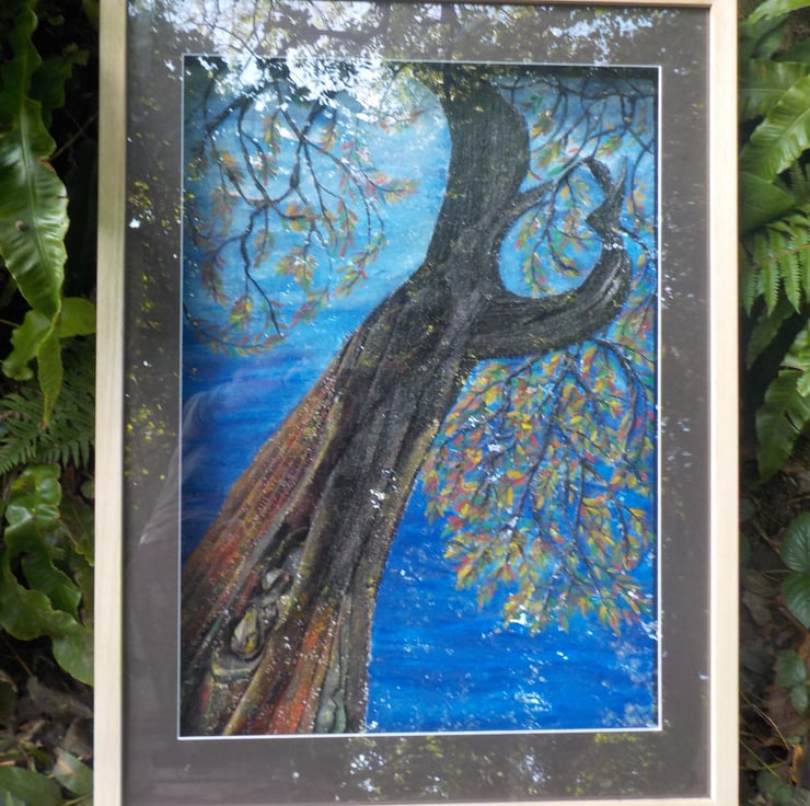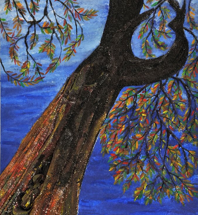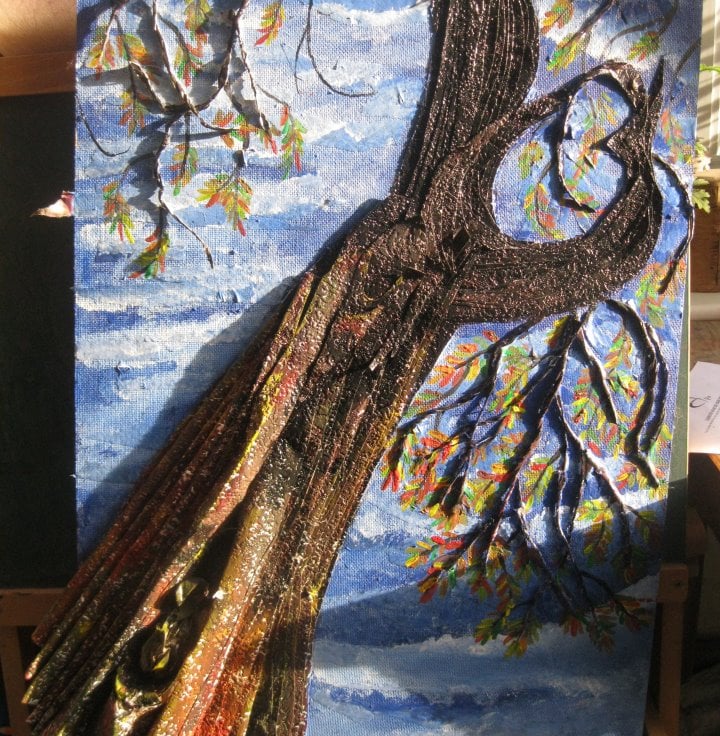 Textured collage of an Ash tree in Autumn slowly loosing it's beautiful coloured leave. The bark and leaves texture are created by a variety of reclaimed materials.