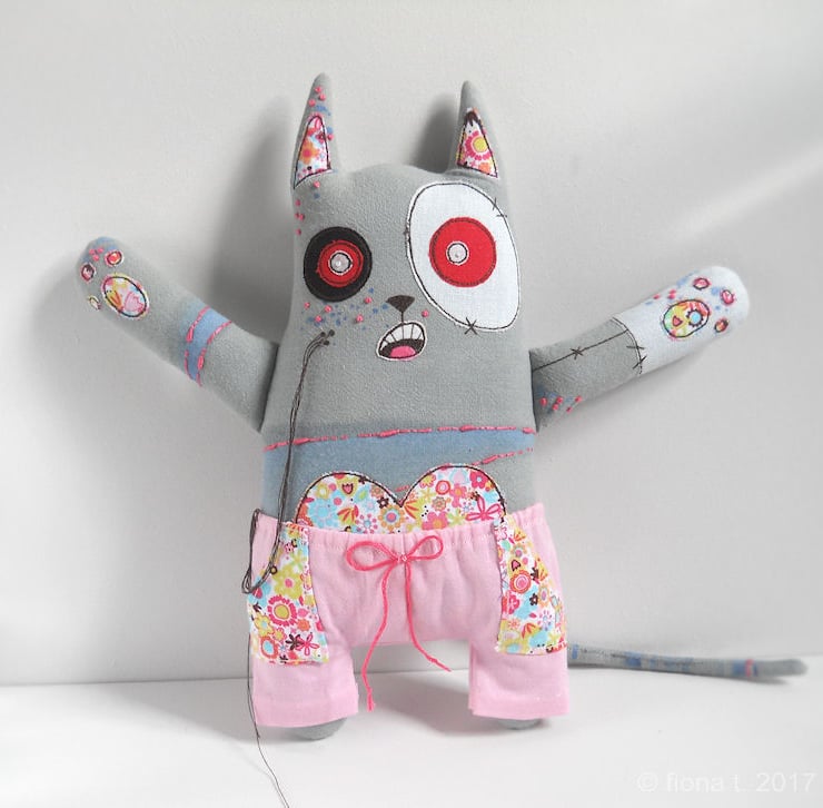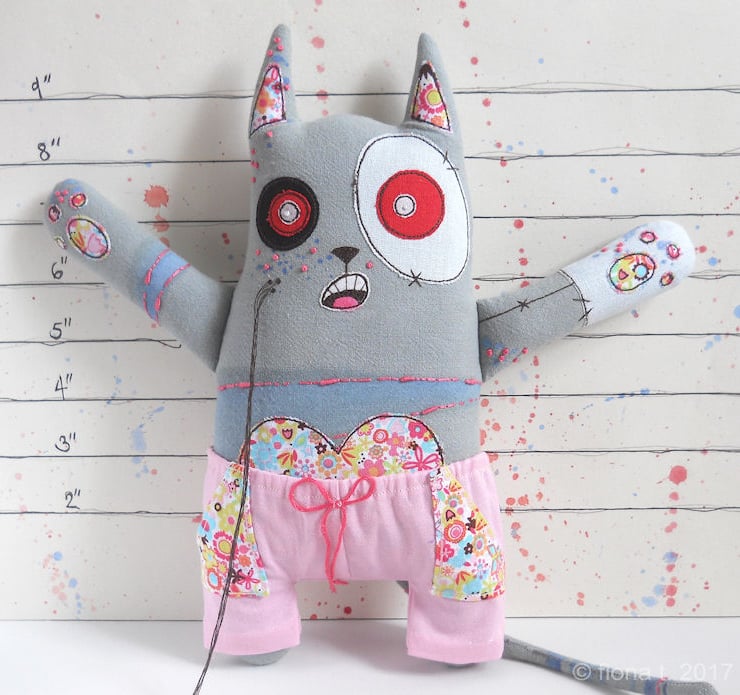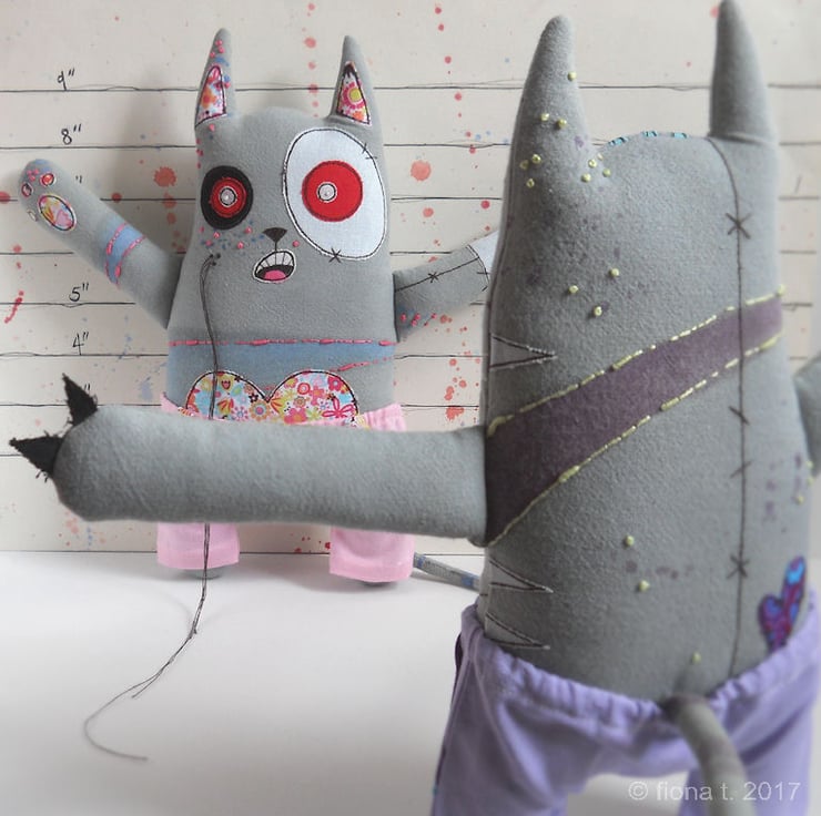 the cats themselves have been made entirely on a domestic sewing machine, everything is cut, stitched & drawn freehand by me.