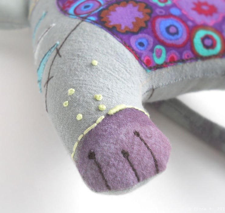 (fabric paint) goop has been spattered, and textural details picked out with hand embroidered french knots and bullion knots. her eyeballs are hand embroidered.