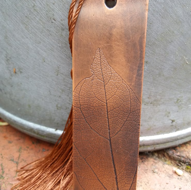 A handmade copper bookmark made in Sheffield,England by Jim.The pattern was achieved by stamping the pewter using an actual leaf.The colour finish is a patination process which gives the bookmark an antiqued appearance which accentuates the leaf vein detailing.The bookmark is fitted with a silky brown tassel