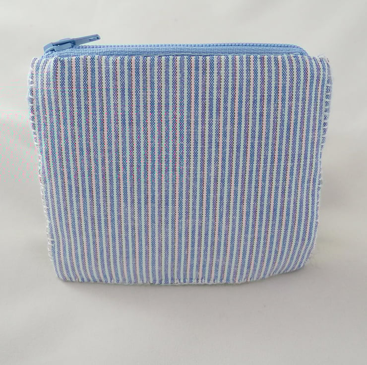 The back of the purse has been stitched from a red, blue and white fabric. The back panel is backed with iron-on interfacing for some structure. The lining is machine stitched, from a blue white and yellow striped fabric, and the zip machine stitched to the lining. The purse outer is hand stitched and then hand-stitched to the assembled lining.