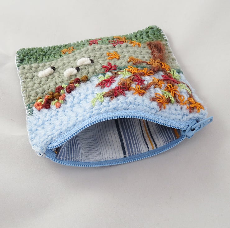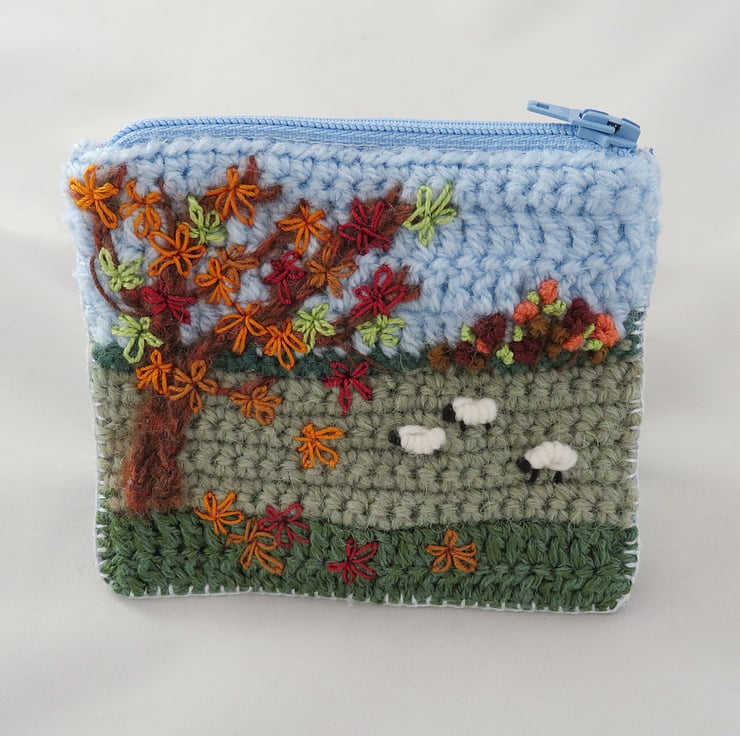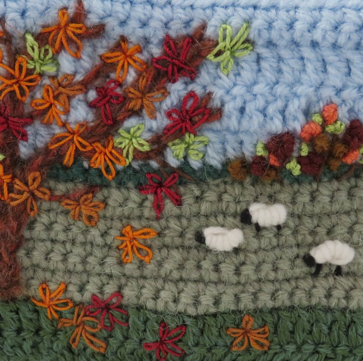 The front of this purse is hand crocheted to represent a meadow landscape. An autumn tree, fallen leaves, a distant hedgerow and tiny sheep have been hand embroidered using a mixture of wools and cotton threads.